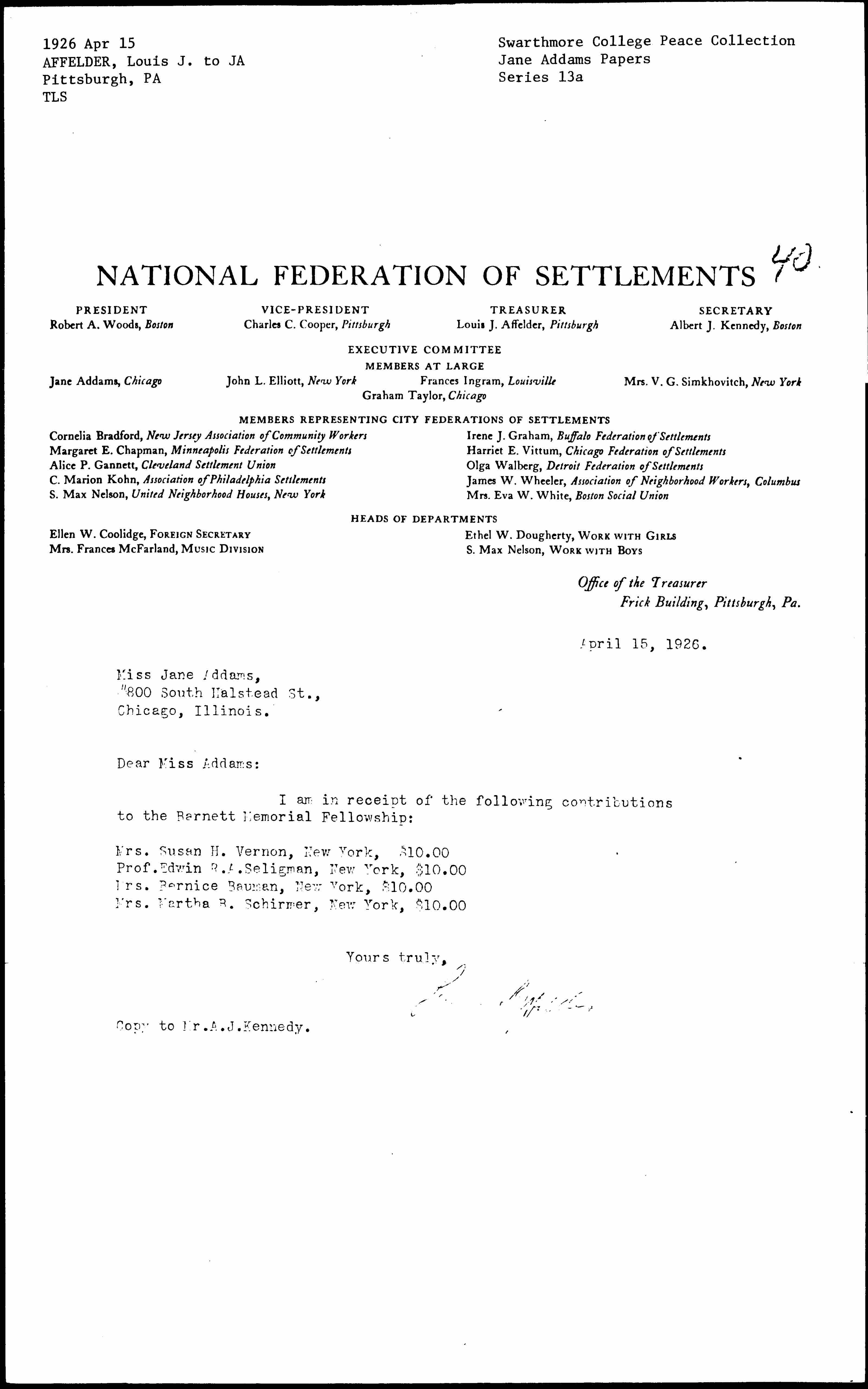 I am in receipt of the following contributions to the Barnett Memorial Fellowship:
