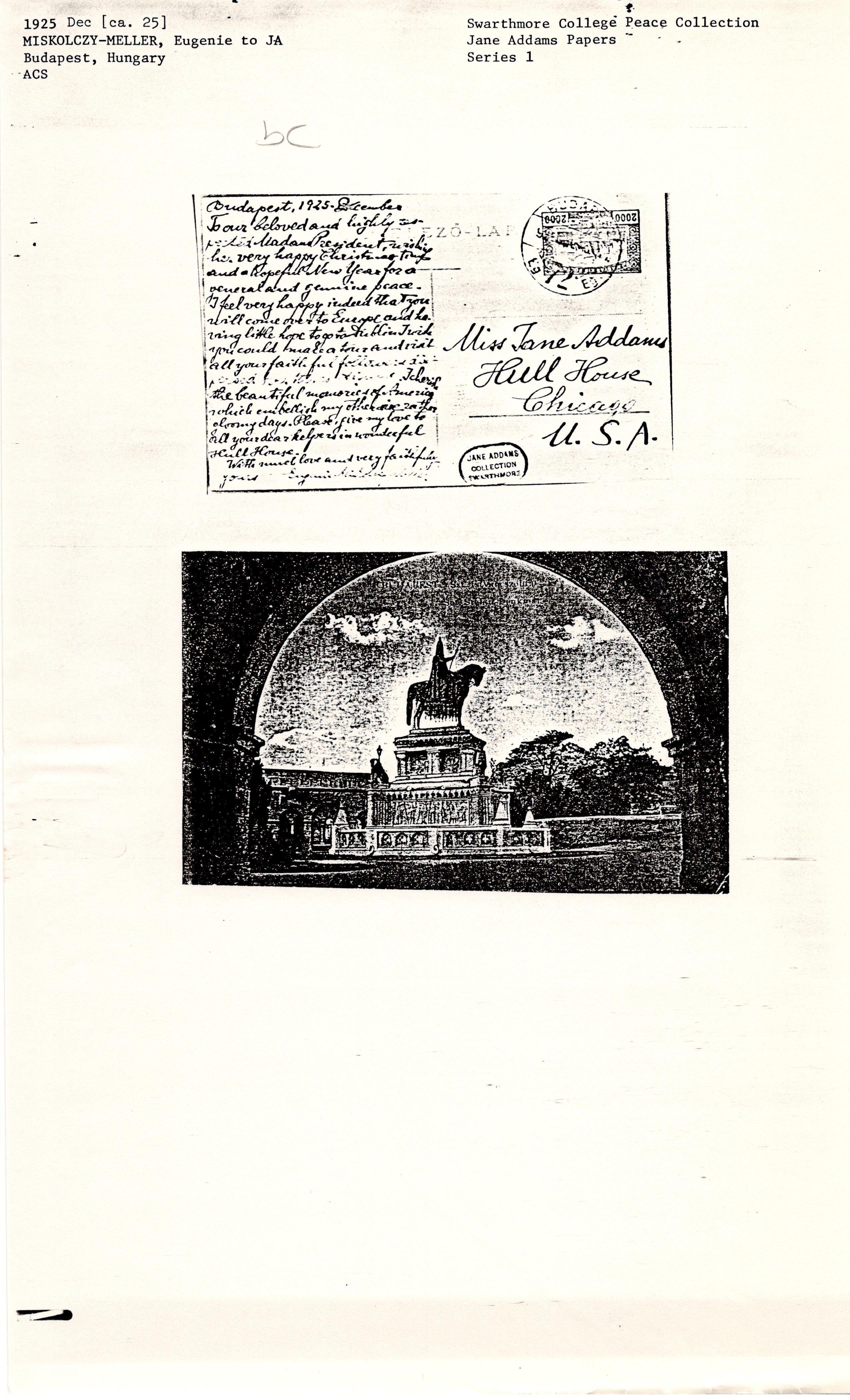 To our beloved and highly respected Madam President, wishing [her] very happy Christmas times and a hopeful New Year for a general and genuine peace. I feel very happy indeed that you will come over to Europe and having little hope to go to Dublin I wish you could make a tour and visit all your faithful followers [illegible]. I cherish the beautiful memories of America which embellish my otherwise rather gloomy days. Please, give my love to all your dear helpers in wonderful Hull House.