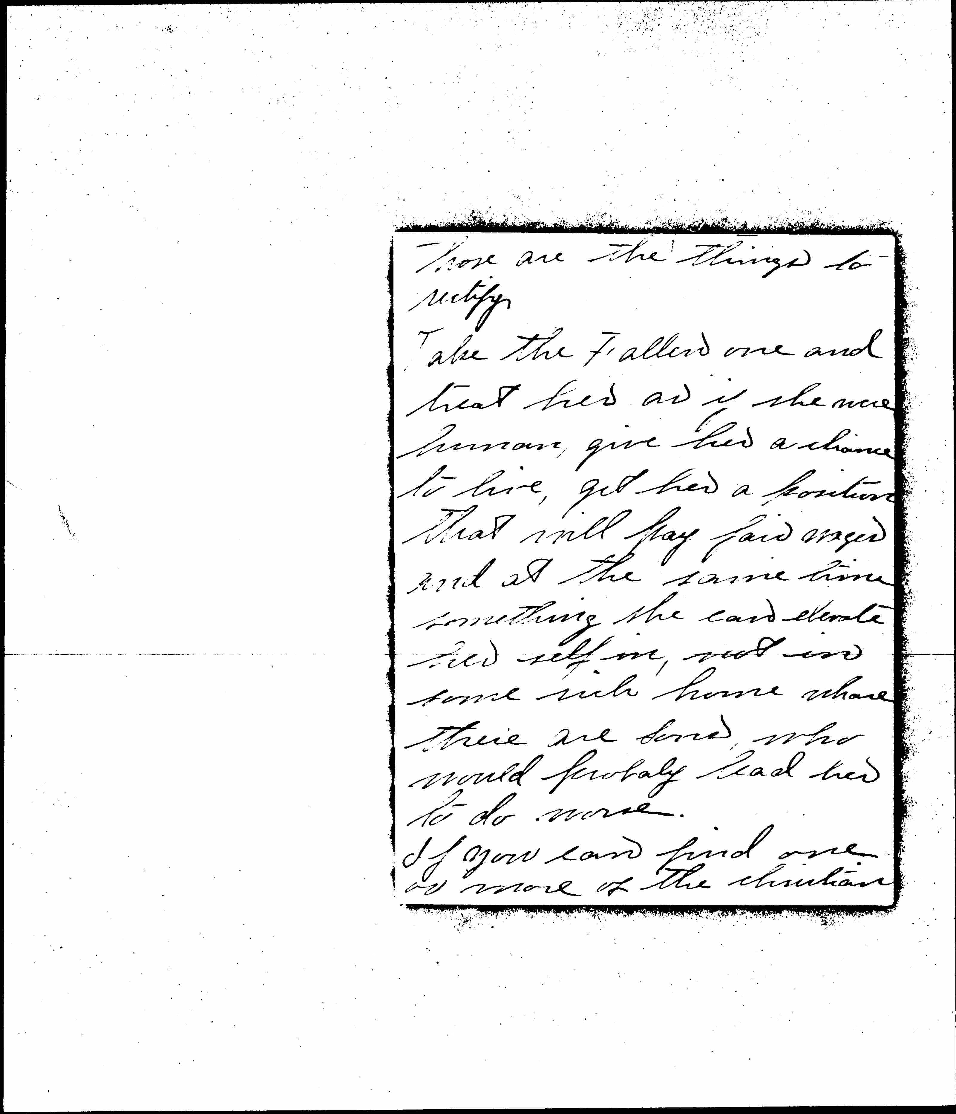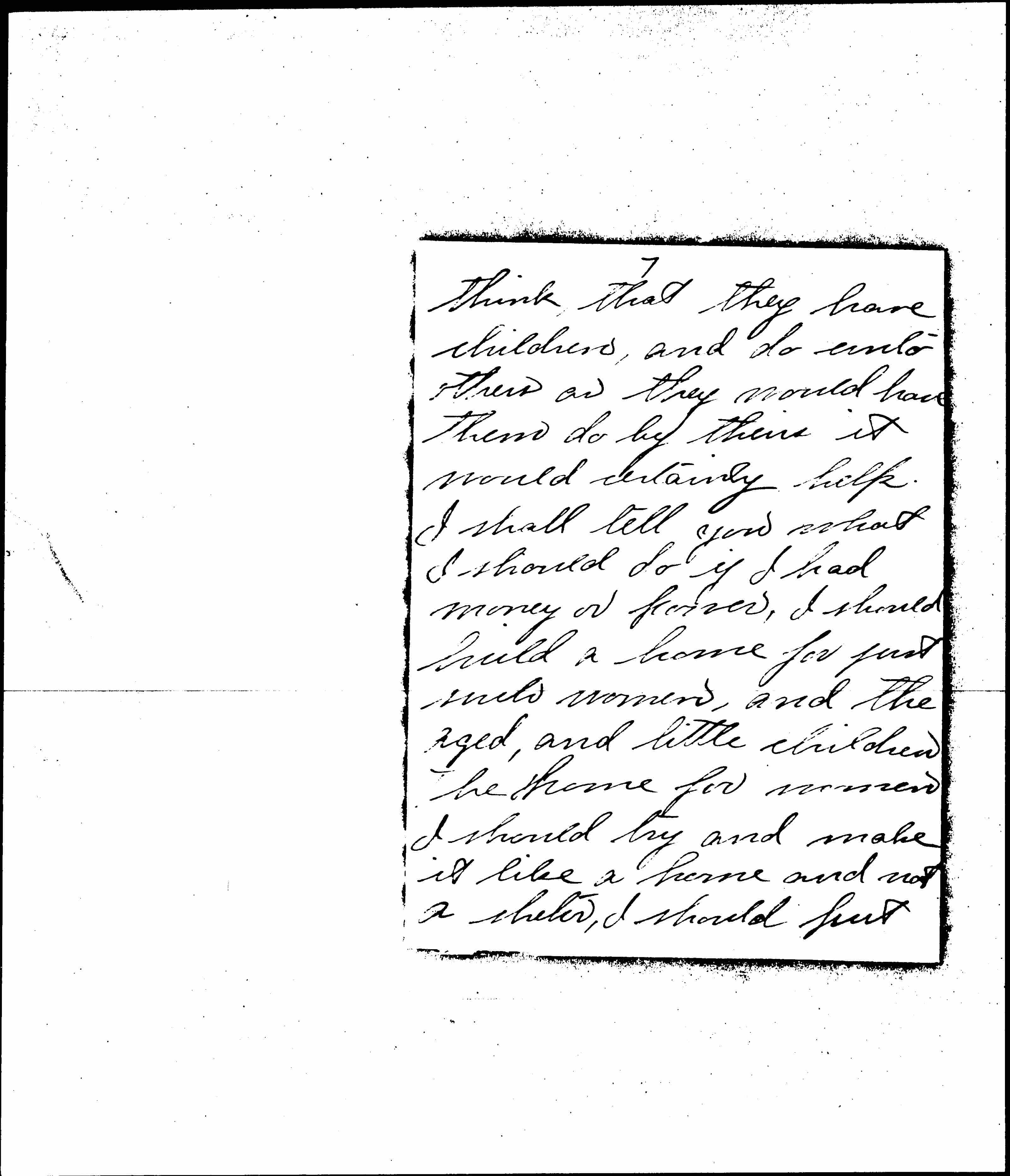 If Mothers could stop and [page 7] think, that they have children, and do unto others as they would have them do by theirs it would certainly help. I shall tell you what I should do if I had money or power, I should build a home for just such women, and the aged, and little children. The home for women I should try and make it like a home and not a shelter, I should put [page 8] them on their honor, and not watch any move they made.