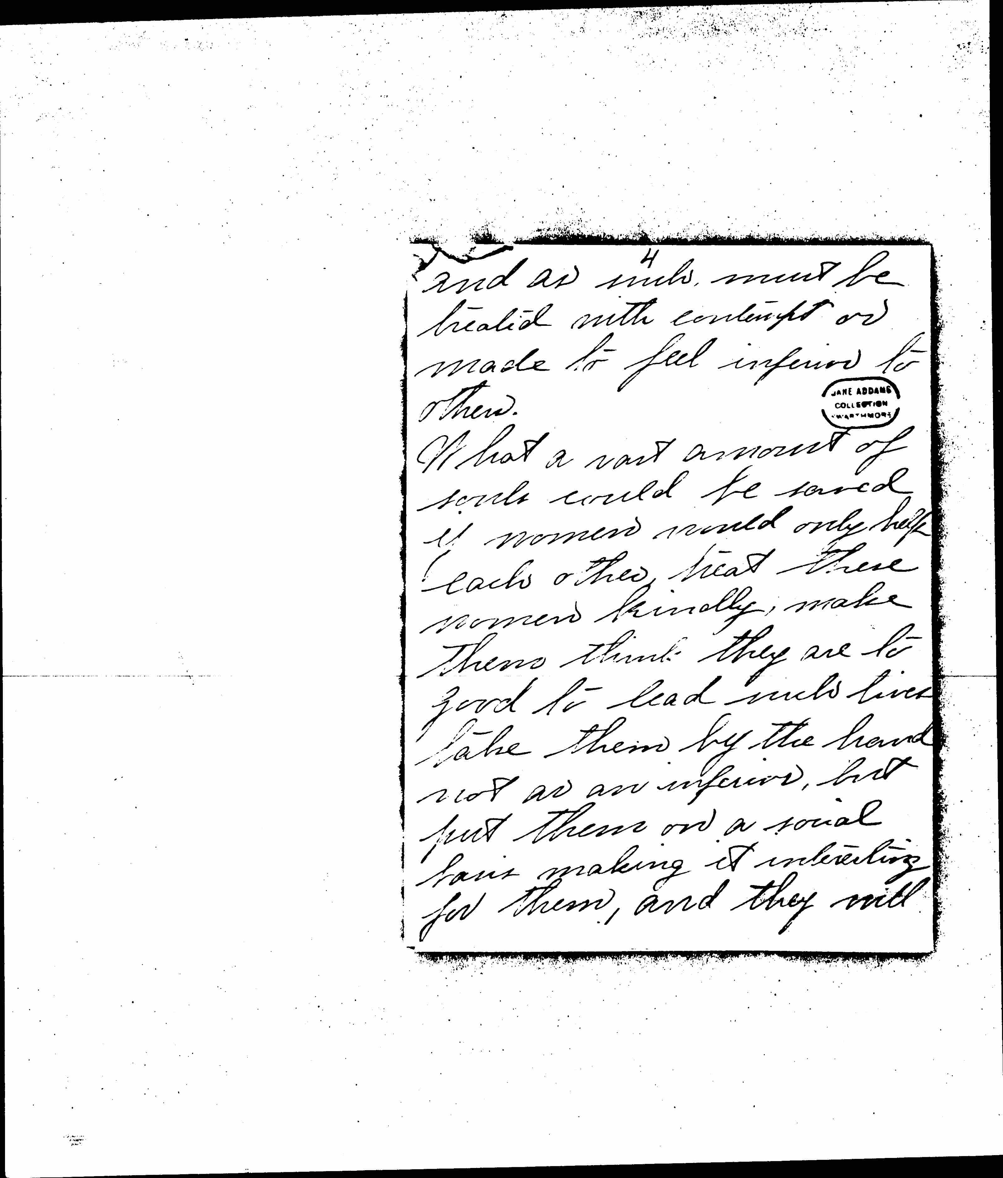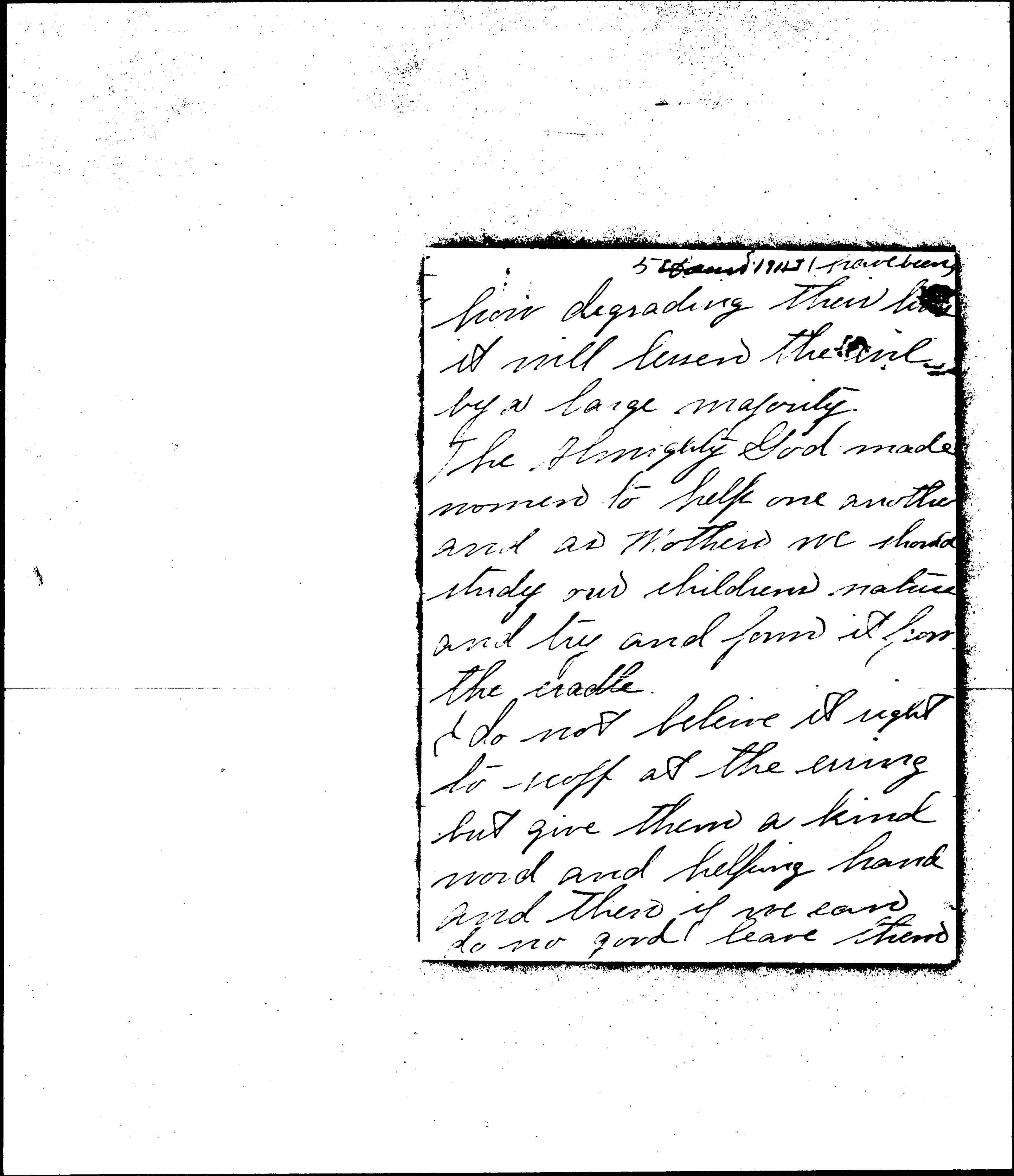 What a vast amount of souls could be saved if women would only help each other, treat these women kindly, make them think they are [too] good to lead such lives take them by the hand not as an inferior, but put them on a social basis making it interesting for them, and they will [page 5] have been, how degrading their lives it will lessen the evil by a large majority.