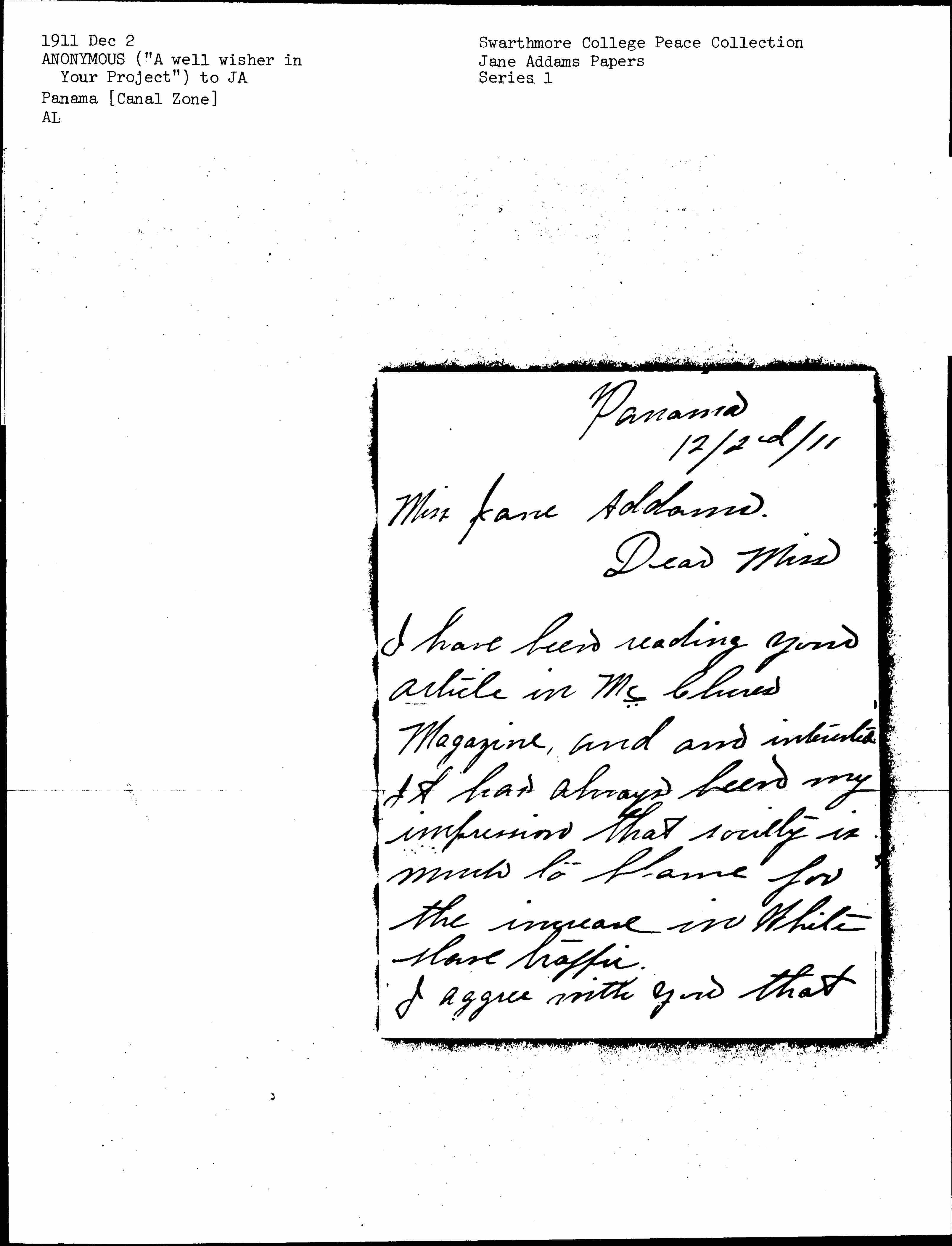 I have been reading your article in McClure's Magazine, and am interested. It had always been my impression that society is much to blame for the increase in White slave traffic.