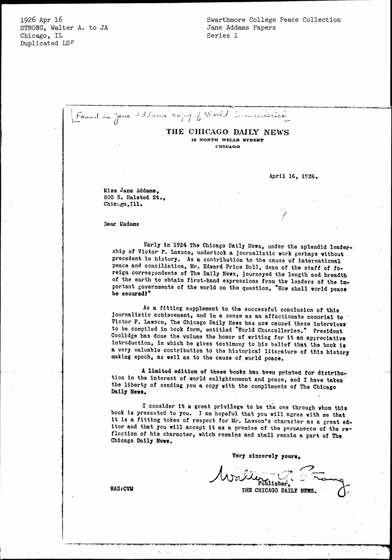 A limited edition of these books has been printed for distribution in the interest of world enlightenment and peace, and I have taken the liberty of sending you a copy with the compliments of The Chicago Daily News.