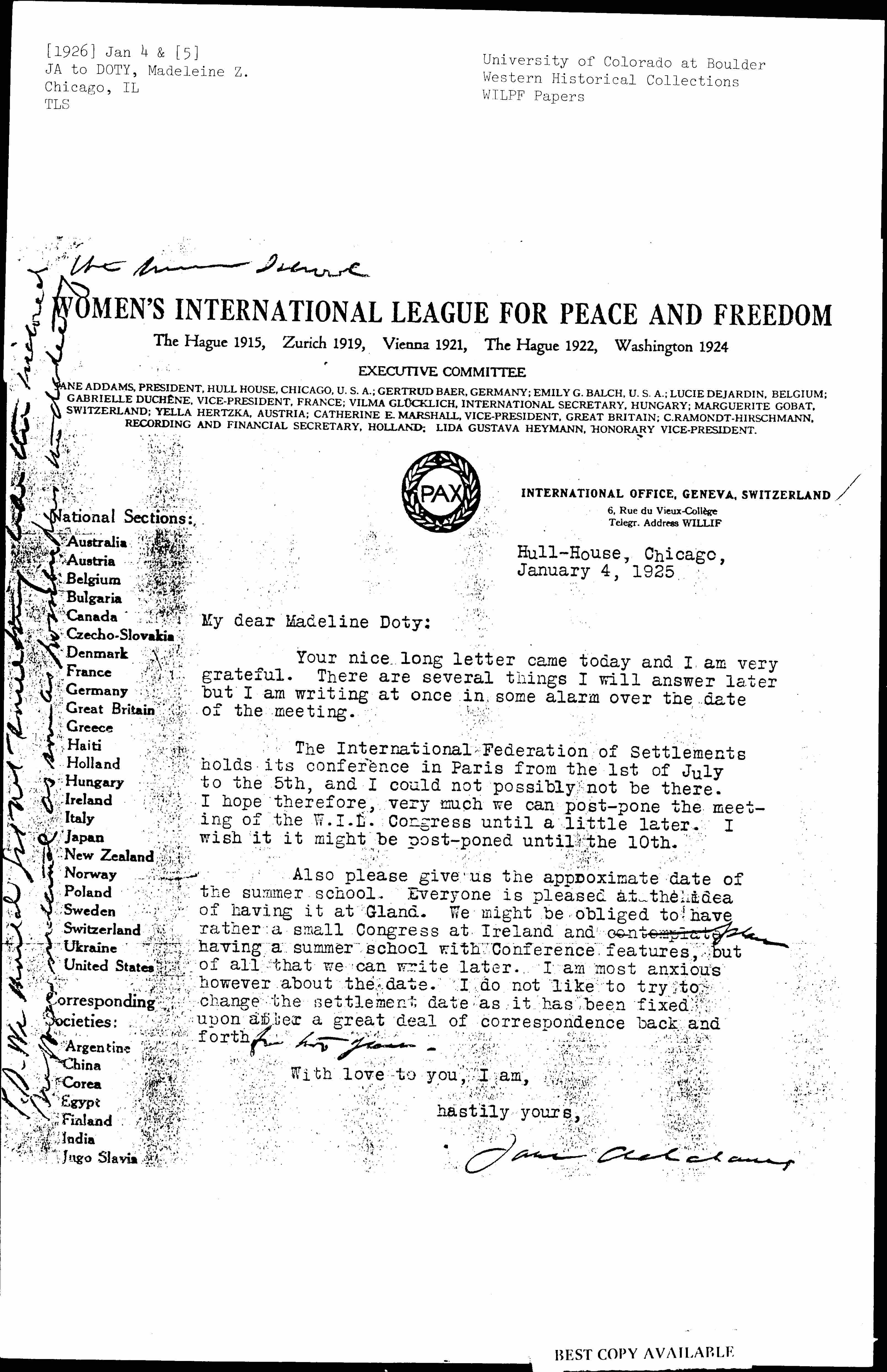 The International Federation of Settlements holds its conference in Paris from the 1st of July to the 5th, and I could not possibly not be there. I hope therefore, very much we can [postpone] the meeting of the W.I.L. Congress until a little later. I wish it might be [postponed] until the 10th.