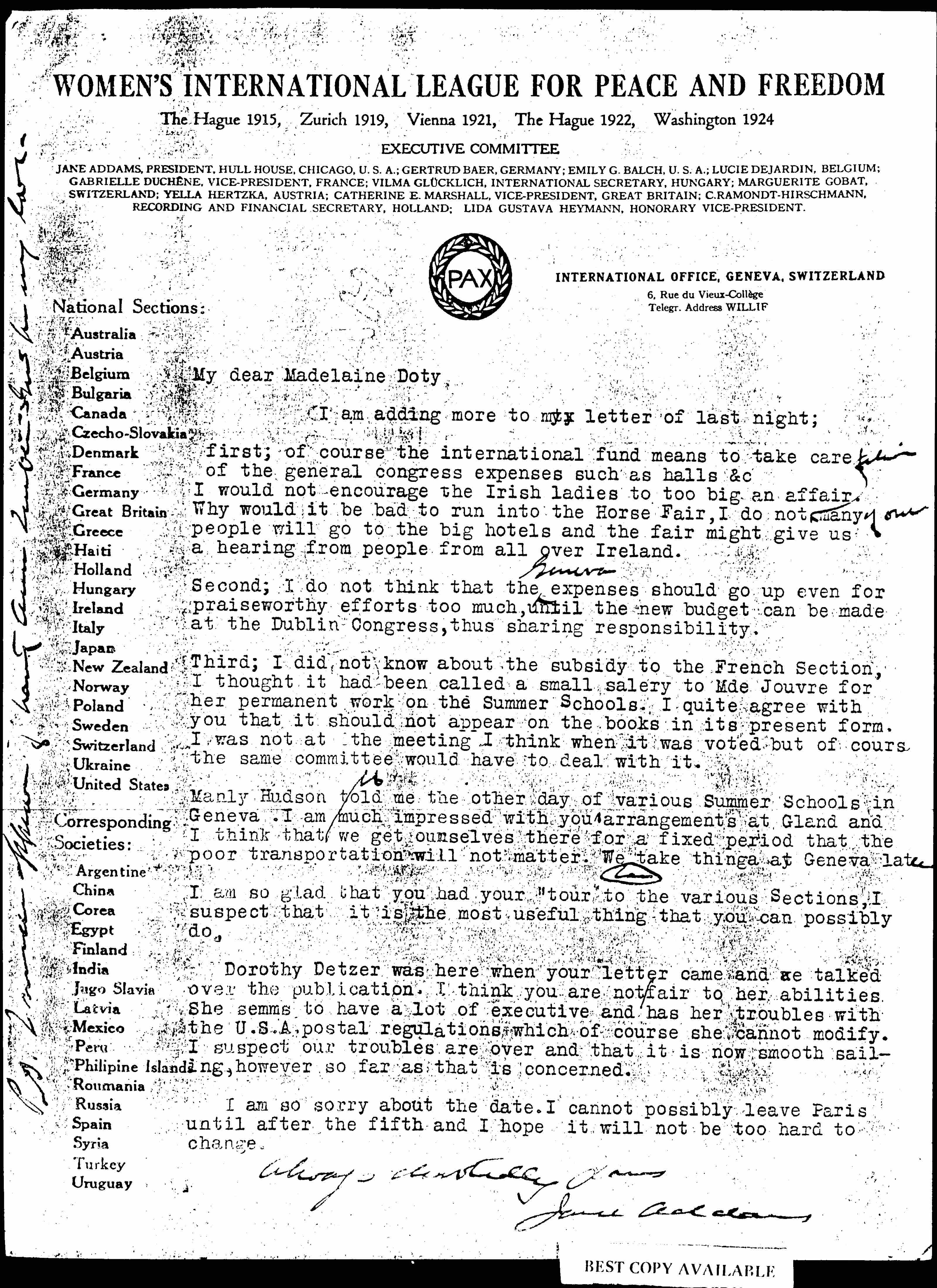 I am adding more to [my] letter of last night; first; of course the international fund means to take care of the general congress expenses such as halls [etc.] I would not encourage the Irish ladies to too big an affair. Why would it be bad to run into the Horse Fair, I do not ↑believe↓ many ↑of our↓ people will go to the big hotels and the fair might give us a hearing from people from all over Ireland.