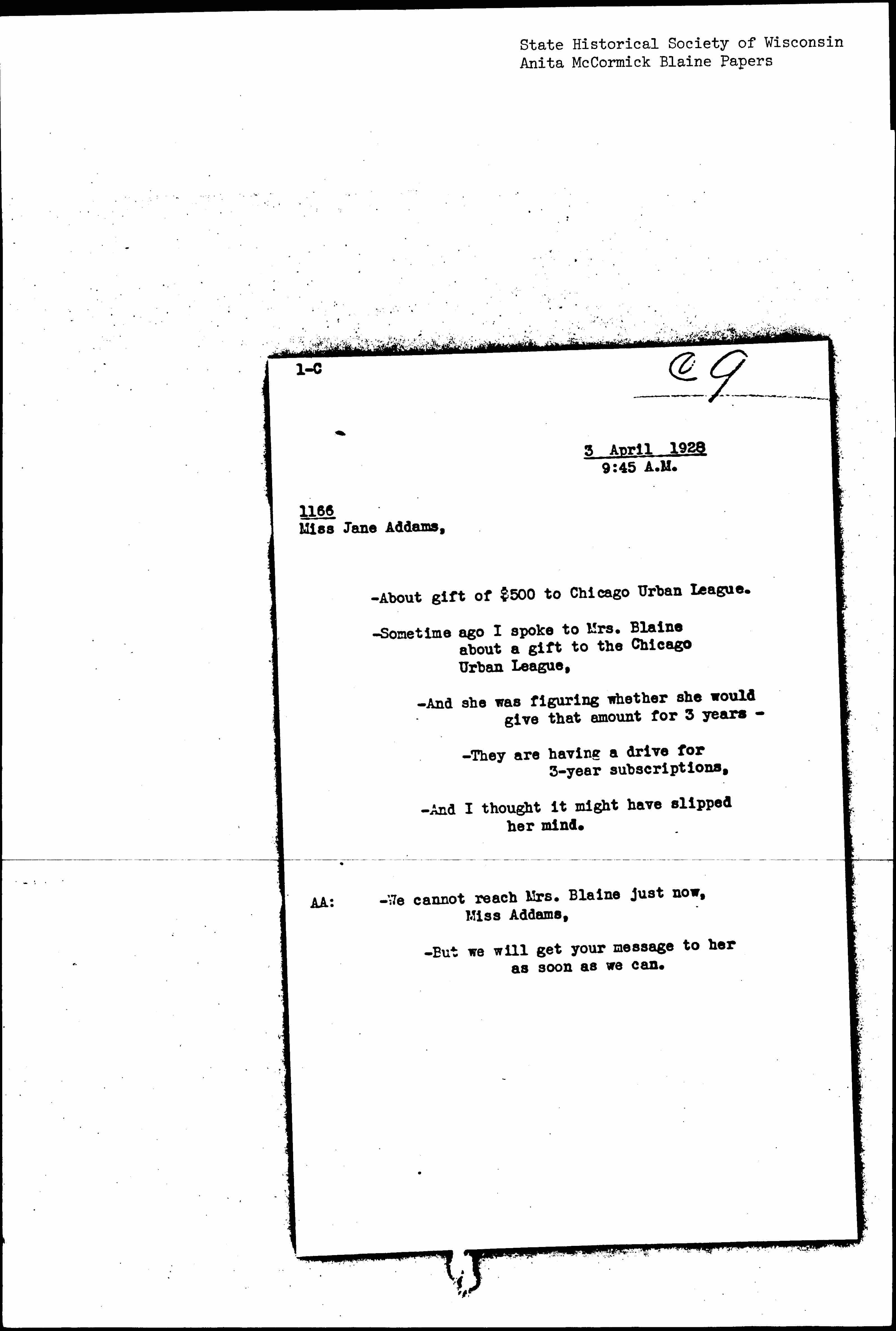 Phone conversation between Jane Addams and Anita McCormick Blaine's Secretary, April 3, 1928
