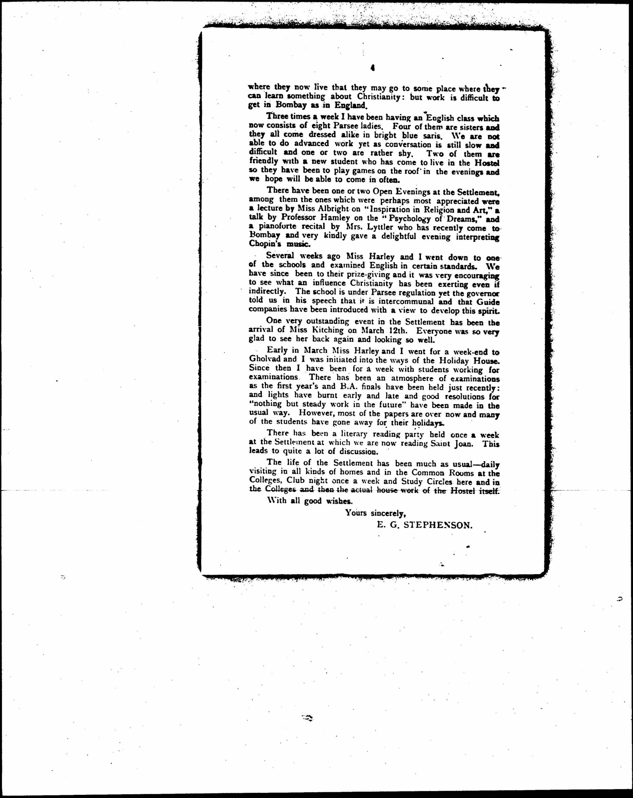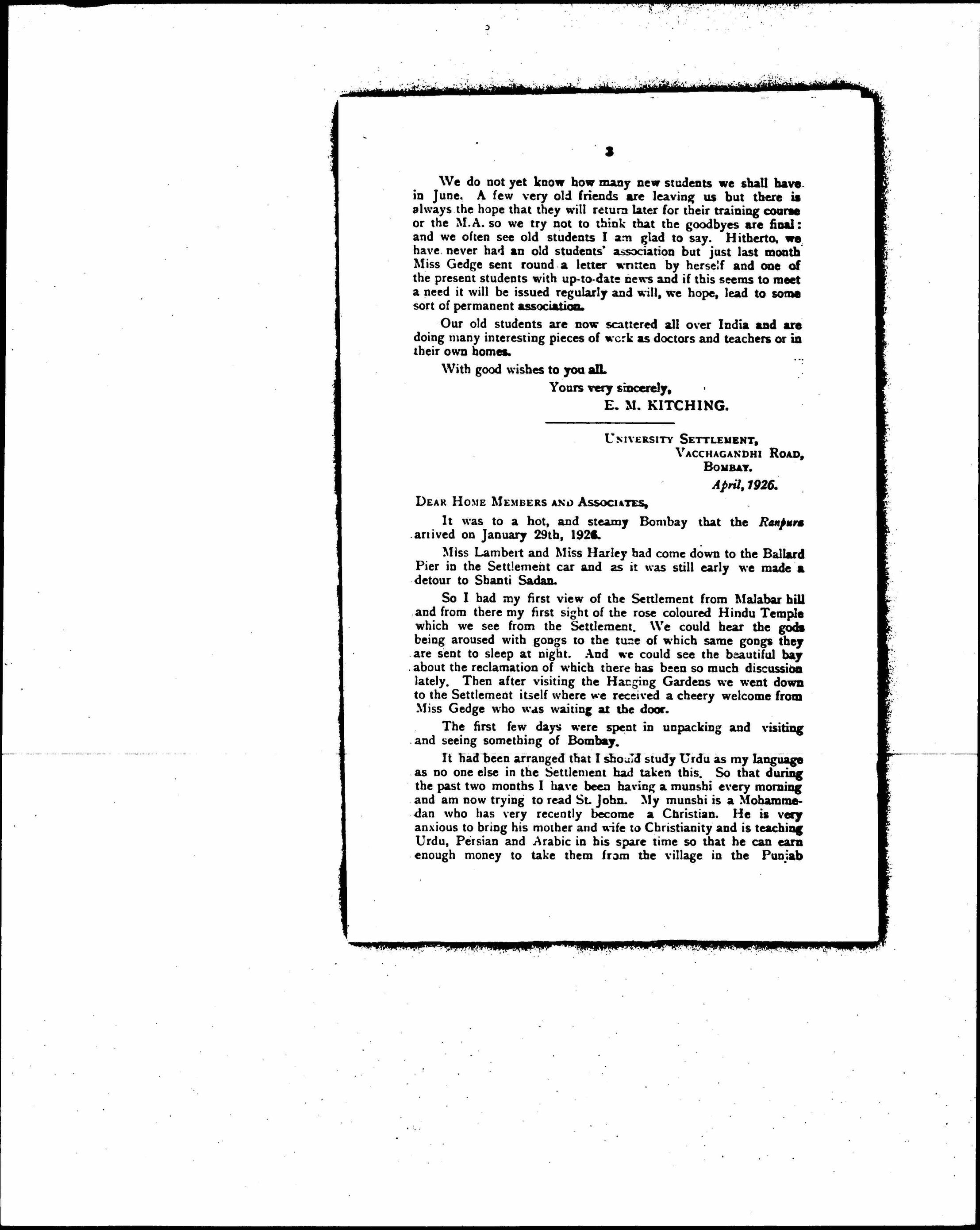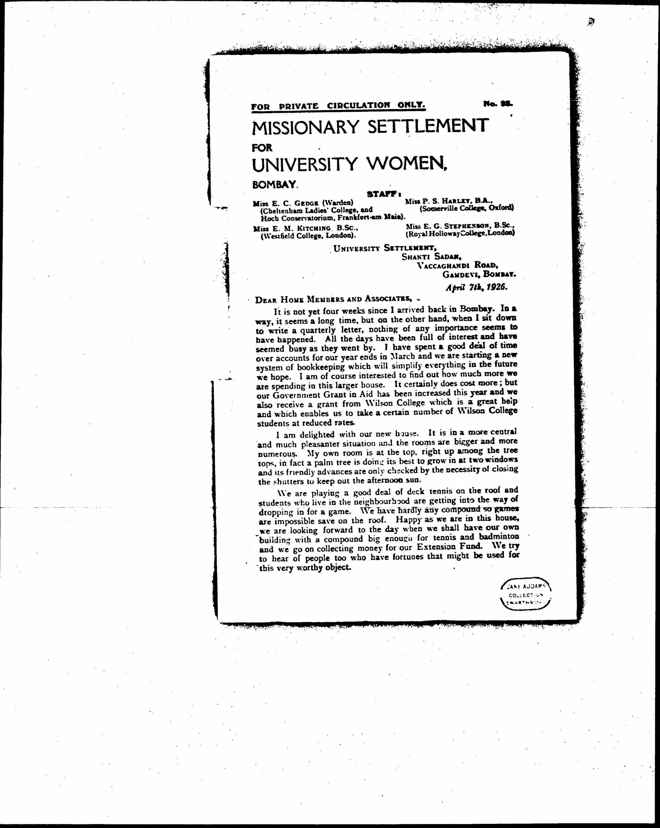 Esther Marie Kitching and E. G. Stephenson to the Members and Friends of the Missionary Settlement for University Women, April 7, 1926