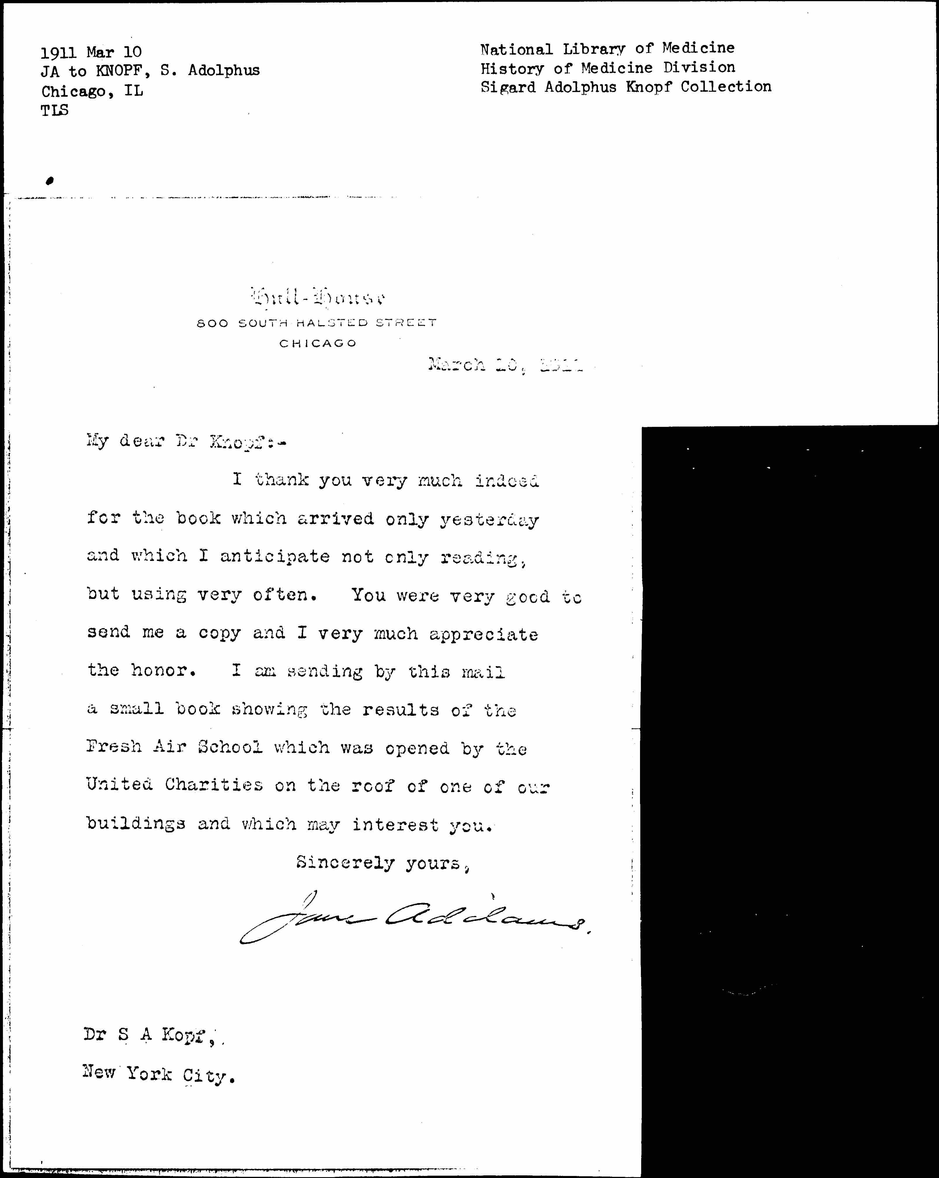 I thank you very much indeed for the book which arrived only yesterday and which I anticipate not only reading, but using very often. You were very good to send me a copy and I very much appreciate the honor. I am sending by this mail a small book showing the results of the Fresh Air School which was opened by the United Charities on the roof of one of our buildings and which may interest you.