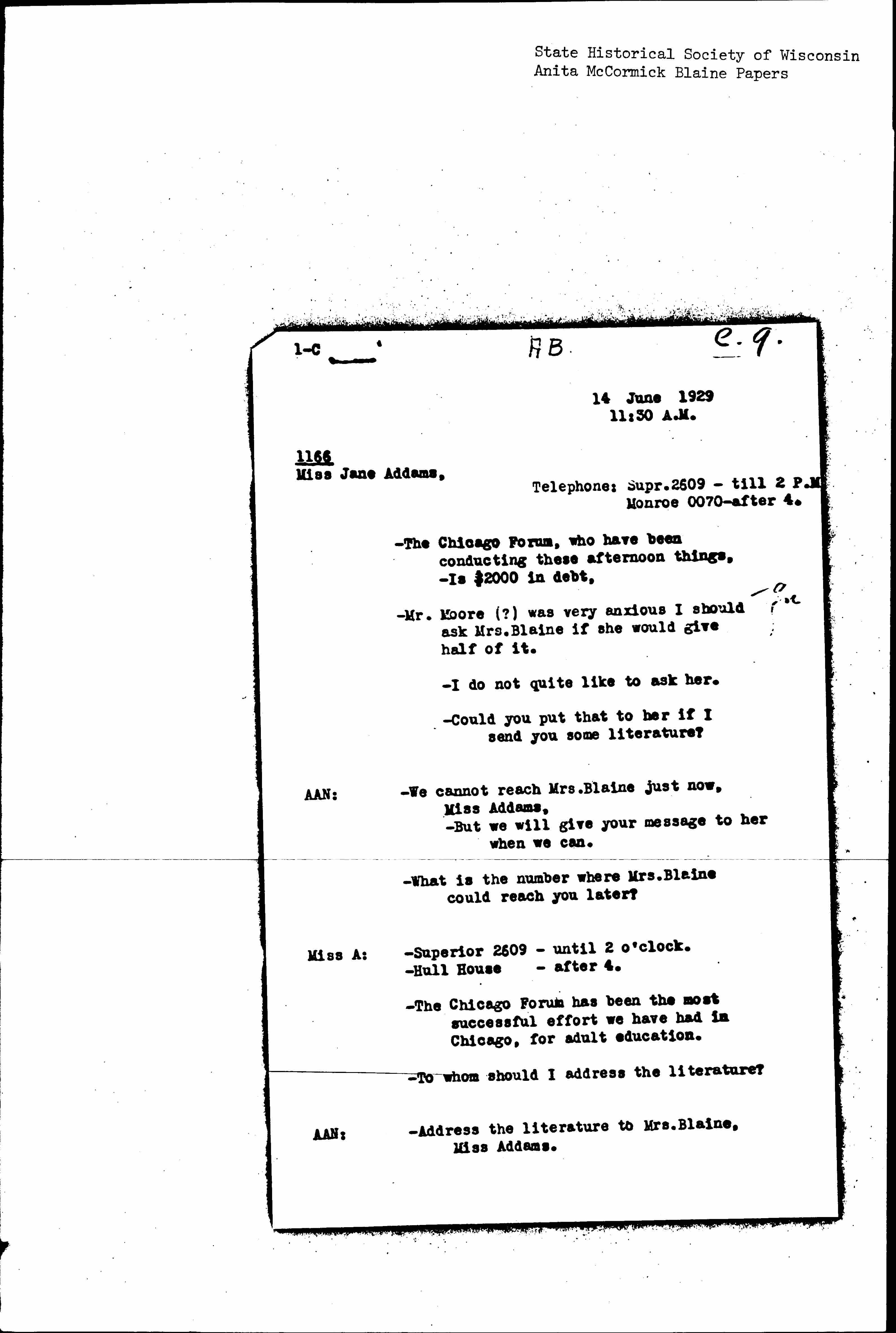 Telephone conversation between Jane Addams and Anita McCormick Blaine's secretary, June 14, 1929