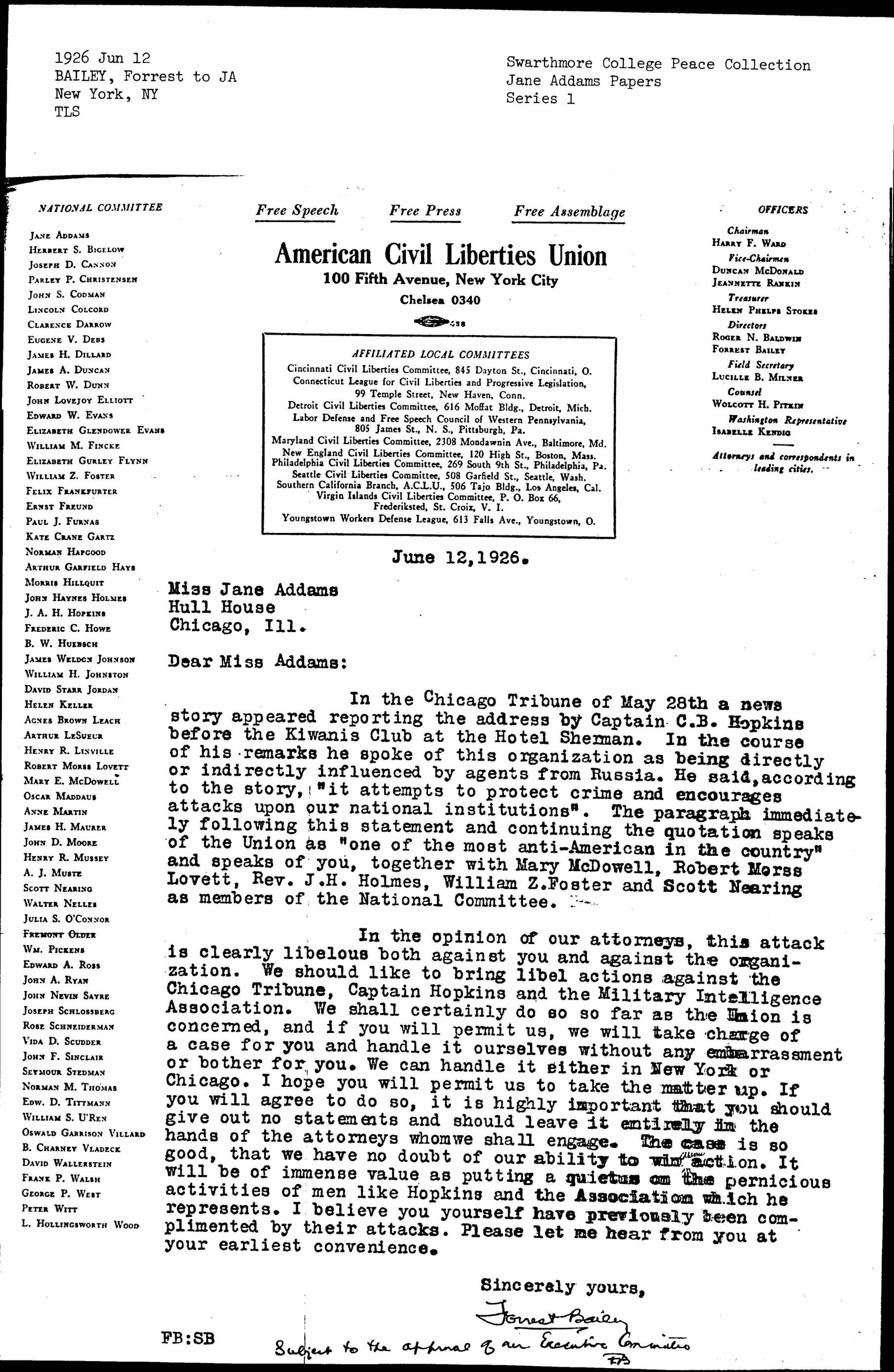 In the Chicago Tribune of May 28th a news story appeared reporting the address by Captain C. B. Hopkins before the Kiwanis Club at the Hotel Sherman. In the course of his remarks he spoke of this organization as being directly or indirectly influenced by agents from Russia. He said, according to the story, “it attempts to protect crime and encourages attacks upon our national institutions.” The paragraph immediately following this statement and continuing the quotation speaks of the Union as “one of the most anti-Ameircan in the country” and speaks of you, together with Mary McDowell, Robert Morss Lovett, Rev. J. H. Holmes, William Z. Foster and Scott Nearing as members of the National Committee.