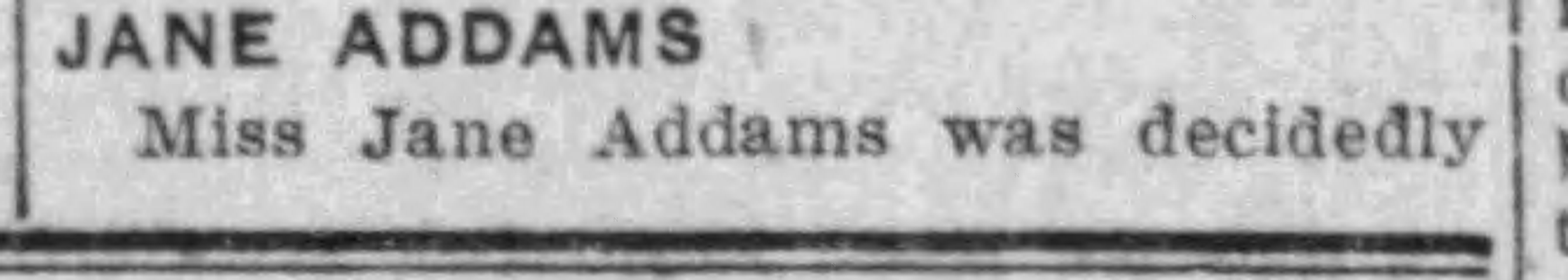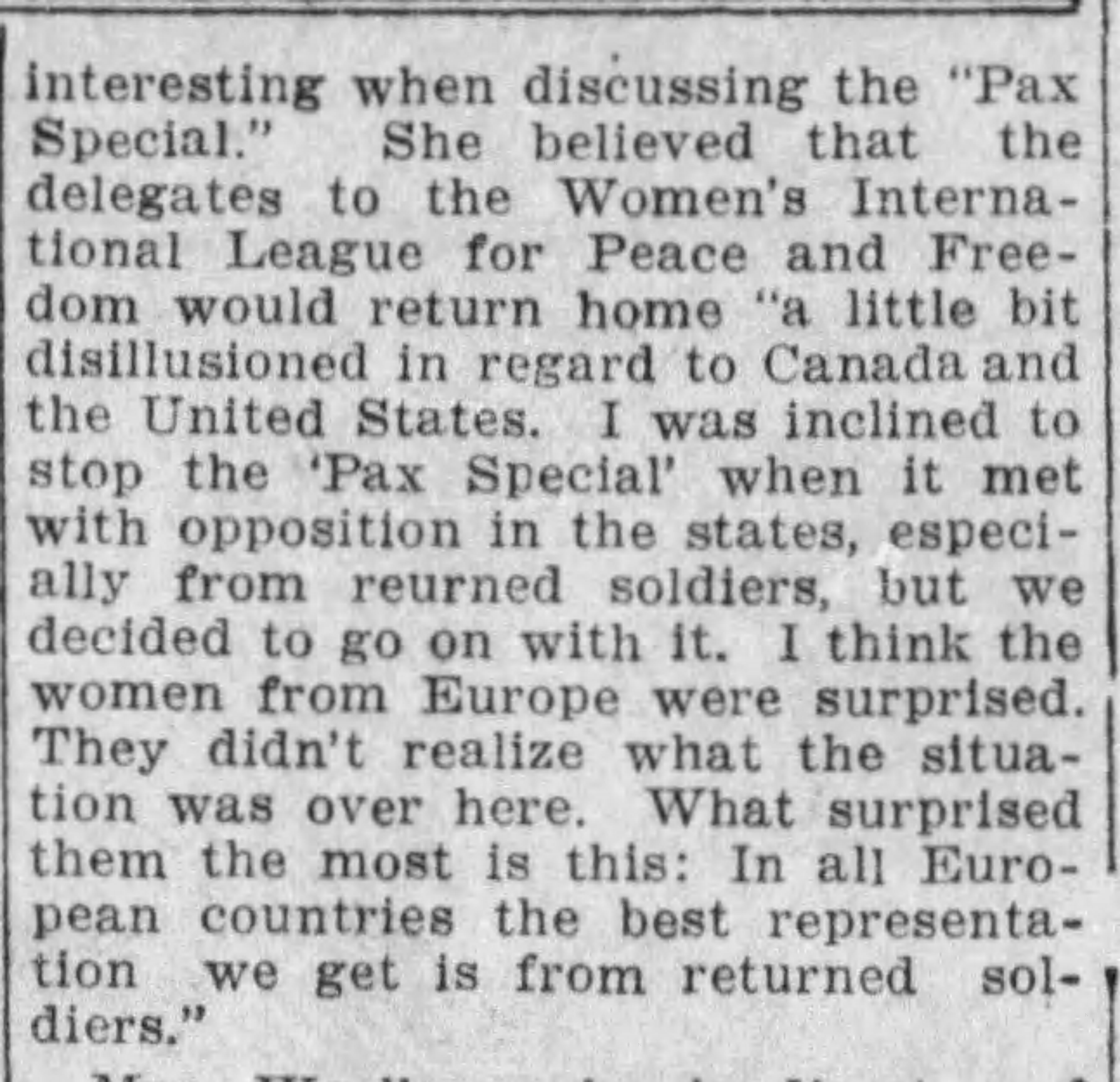 Miss Jane Addams was decidedly [page 2] interesting when discussing the "Pax Special." She believed that the delegates to the Women's International League for Peace and Freedom would return home "a little bit disillusioned in regard to Canada and the United States. I was inclined to stop the 'Pax Special' when it met with opposition from [returned] soldiers, but we decided to go on with it. I think the women from Europe were surprised. They didn't realize what the situation was over here. What surprised them the most is this: In all European countries the best representation we get is from returned soldiers."