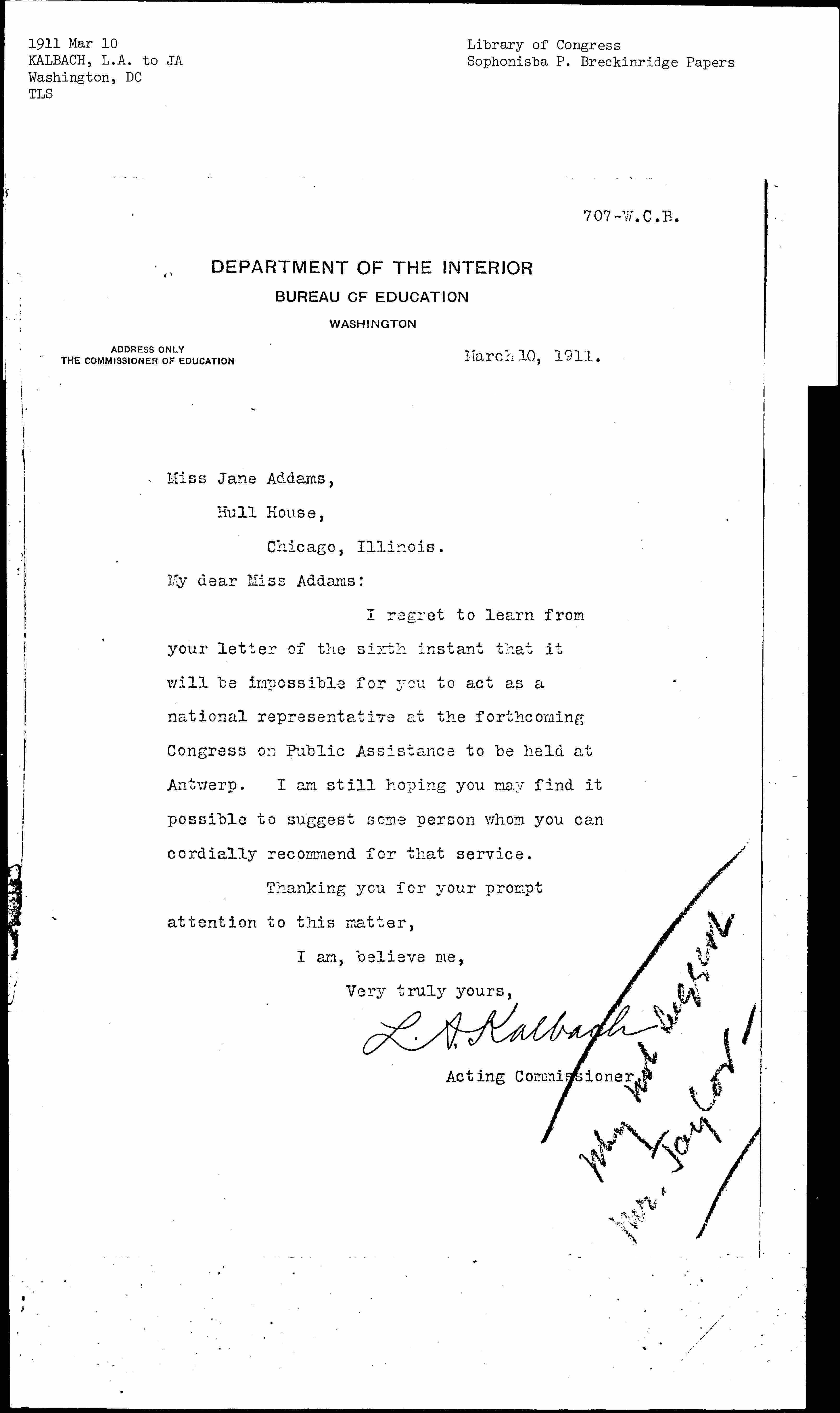 I regret to learn from your letter of the sixth instant that it will be impossible for you to act as a national representative at the forthcoming Congress on Public Assistance to be held at Antwerp. I am still hoping you may find it possible to suggest some person whom you can cordially recommend for that service.