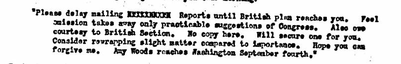 Please delay mailing [illegible] Reports until British plan reaches you. Feel omission takes away only practicable suggestions of Congress. Also owe courtesy to British Section. No copy here. Will secure one for you. Consider rewrapping slight matter compared to importance. Hope you can forgive me. Amy Woods reaches Washington September fourth.