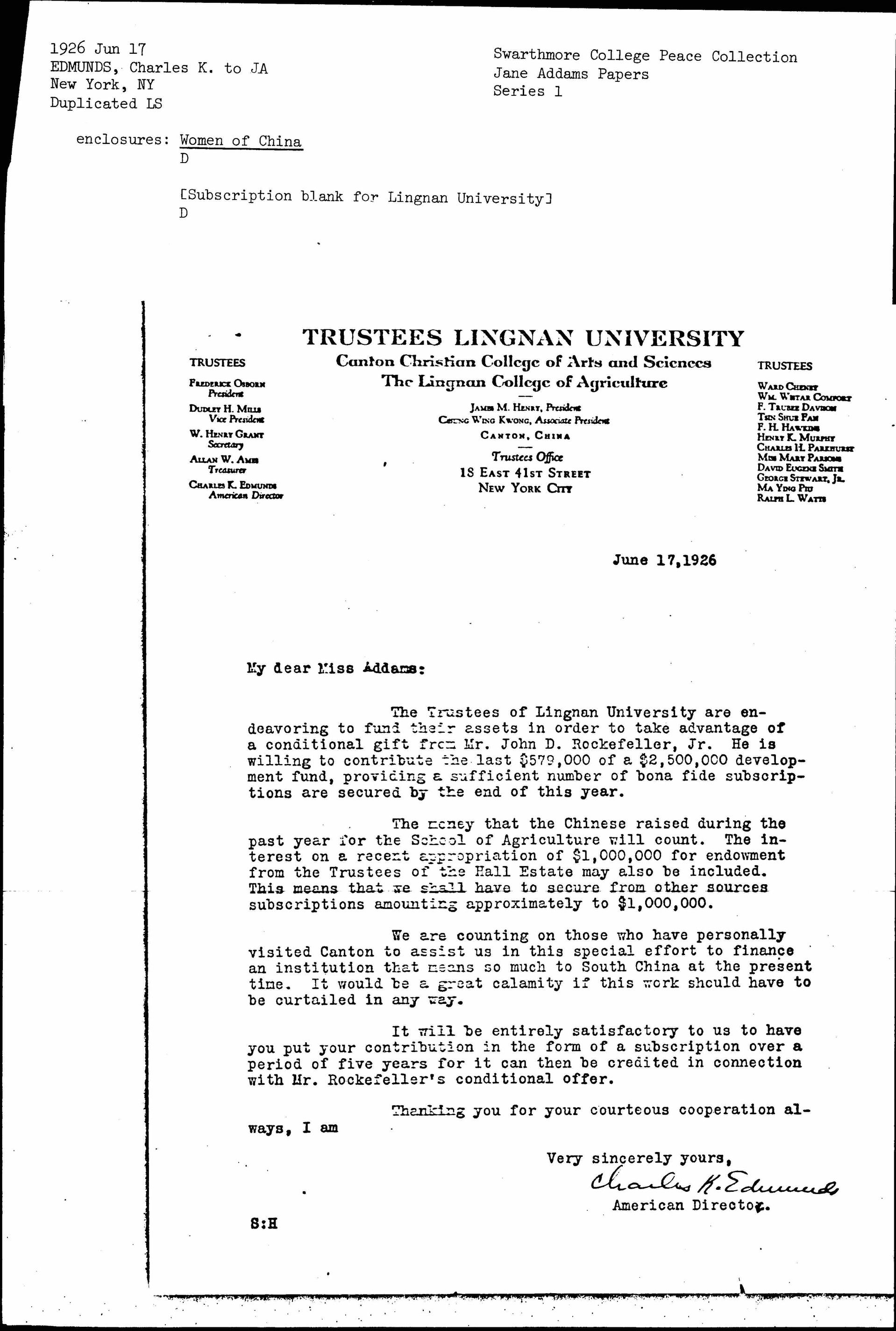 The Trustees of Lingnan University are endeavoring to fund their assets in order to take advantage of a conditional gift from Mr. John D. Rockefeller, Jr. He is willing to contribute the last $579,000 of a $2,500,000 development fund, providing a sufficient number of bona fide subscriptions are secured by the end of this year.