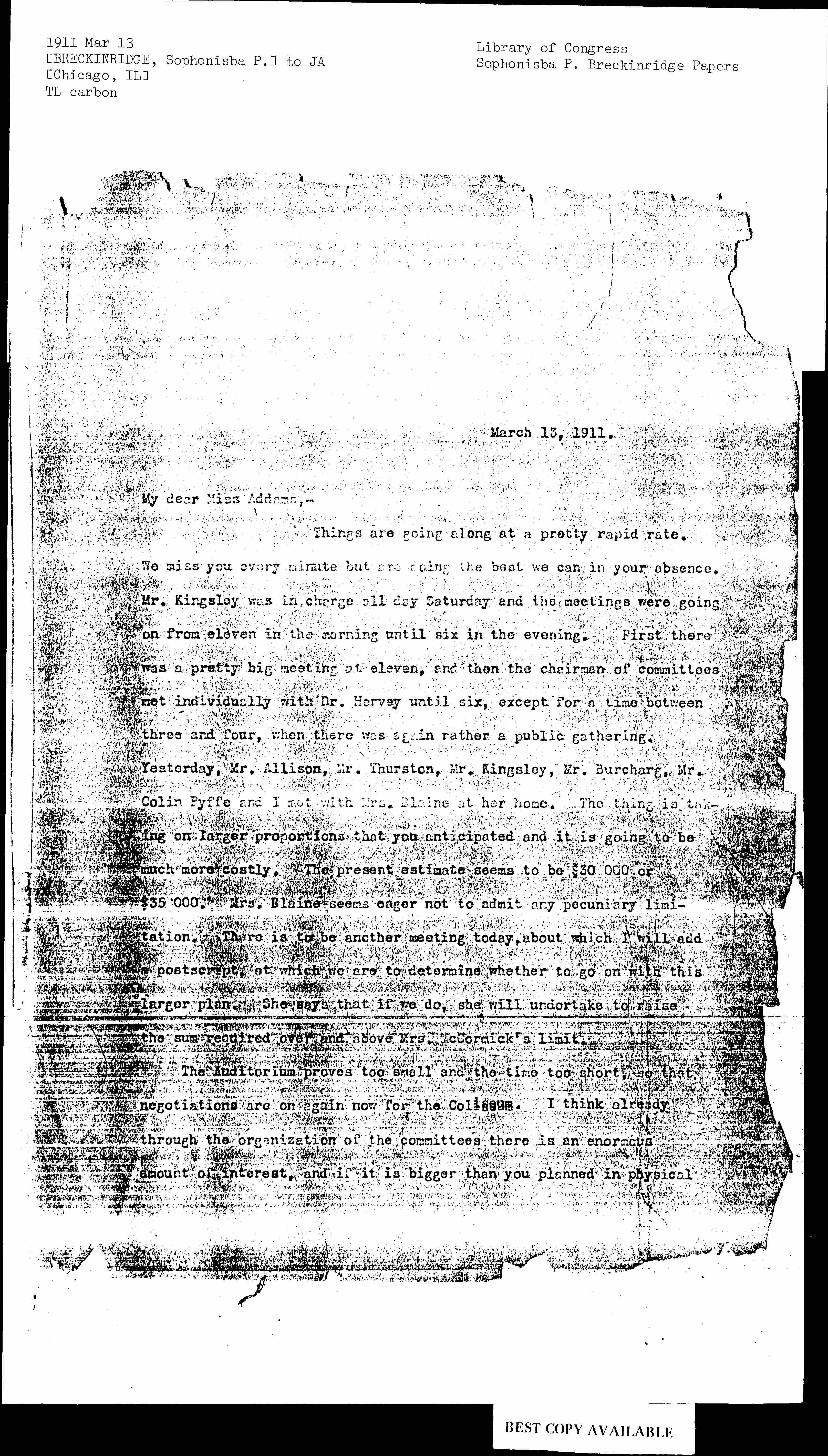 Things are going along at pretty rapid rate. We miss you every minute but are doing the best we can in your absence. Mr. Kingsley was in charge all day Saturday and the meetings were going on from eleven in the morning until six in the evening. First there was a pretty big meeting at eleven, and then the chairman of committees met individually with Dr. Harvey until six, except for a time between three and four, when there was again rather a public gathering. Yesterday, Mr. Allison, Mr. Thurston, Mr. Kingsley, Mr. [Burchard], Mr. Colin Fyffe and I met with Mrs. Blaine at her home. The thing is taking on larger proportions that you anticipated and it is going to be much more costly. The present estimate seems to be $30,000 or $35,000. Mrs. Blaine seems eager not to admit any pecuniary limitation. There is to be another meeting today, about which I will add a postscript, at which we are to determine whether to go on with this larger plan. She says that if we do, she will undertake to raise the sum required over and above Mrs. McCormick's limit.