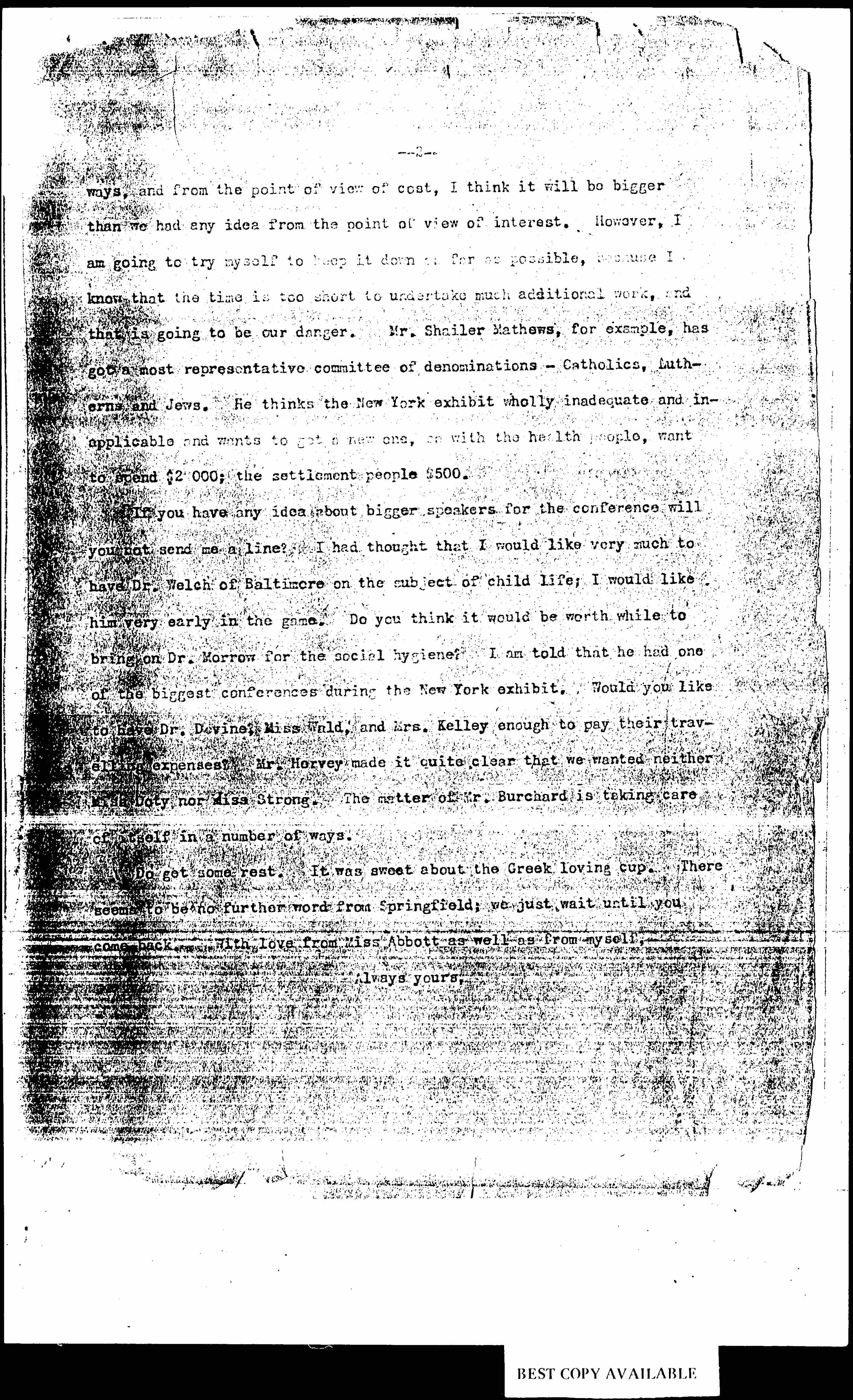 If you have any idea about bigger speakers for the conference will you not send me a line? I had thought that I would like very much to have Dr. Welch of Baltimore on the subject of child life; I would like him very early in the game. Do you think it would be worth while to bring on Dr. Morrow for the social hygiene? I am told that he had one of the biggest conferences during the New York exhibit. Would you like to have Dr. Devine, Miss Wald, and Mrs. Kelley enough to pay their traveling expenses? Mr. Hervey made it quite clear that we wanted neither Miss Doty nor Miss Strong. The matter of Mr. Burchard is taking care of itself in a number of ways.