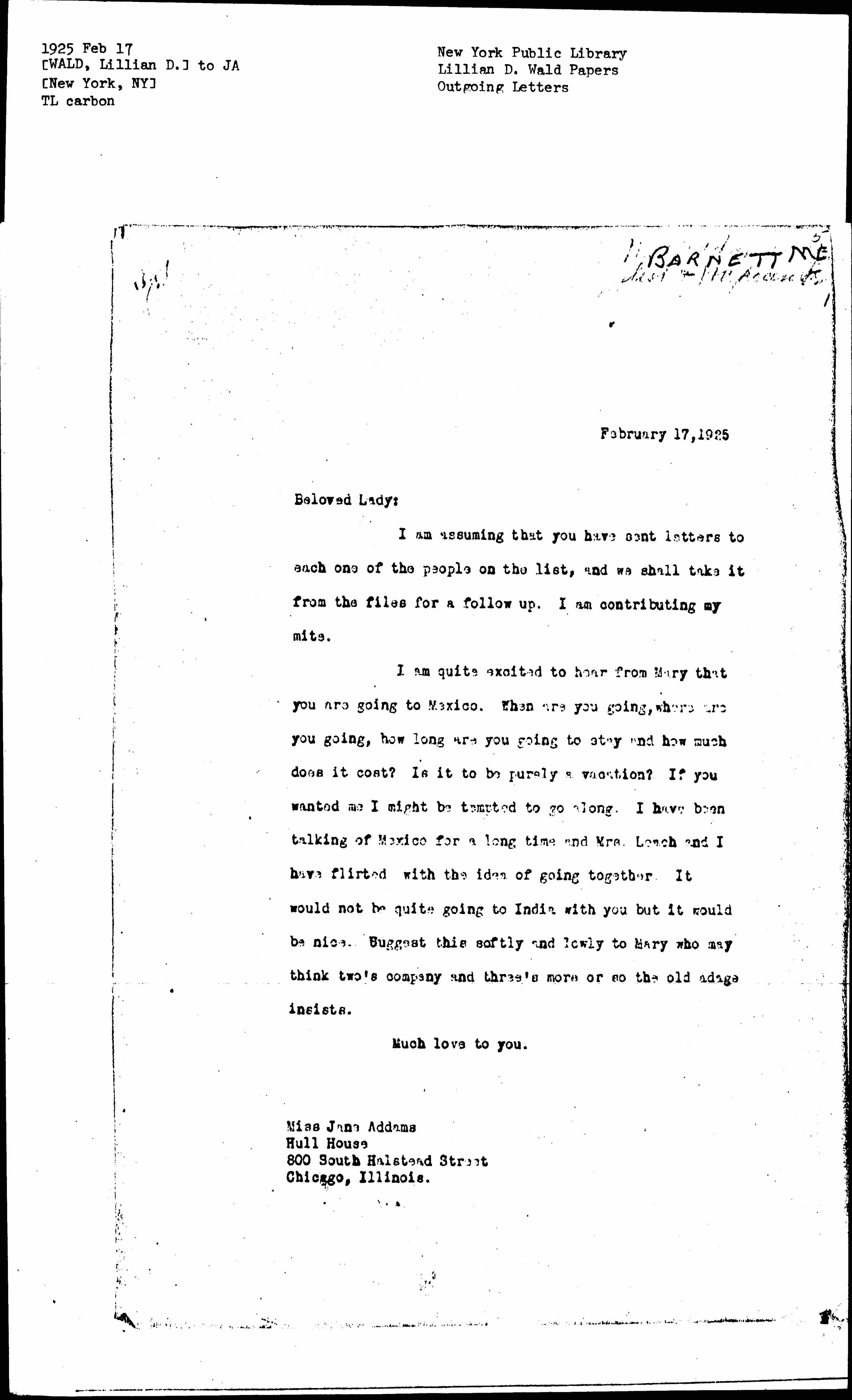 I am quite excited to hear from Mary that you are going to Mexico. When are you going, where are you going, how long are you going to stay and how much does it cost? Is it to be purely a vacation? If you wanted me I might be tempted to go along. I have been talking of Mexico for a long time and Mrs. Leach and I have flirted with the idea of going together. It would not be quite going to India with you but it would be nice. Suggest this softly and lowly to Mary who may think two's company and three's more or so the old adage insists.