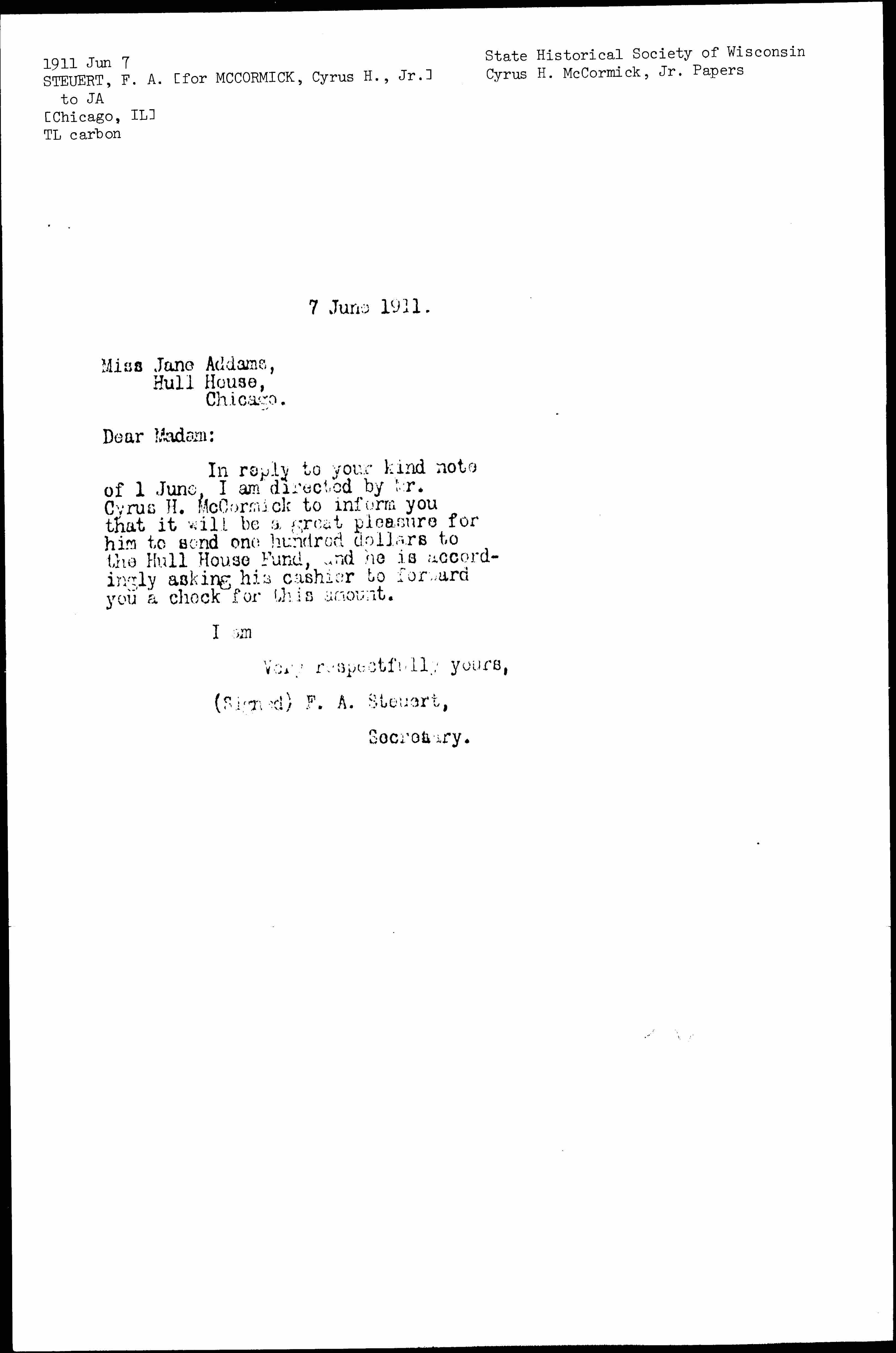 In reply to your kind note of 1 June, I am directed by Mr. Cyrus H. McCormick to inform you that it will be a great pleasure for him to send one hundred dollars to the Hull House Fund, and he is accordingly asking his cashier to forward you a check for this amount.