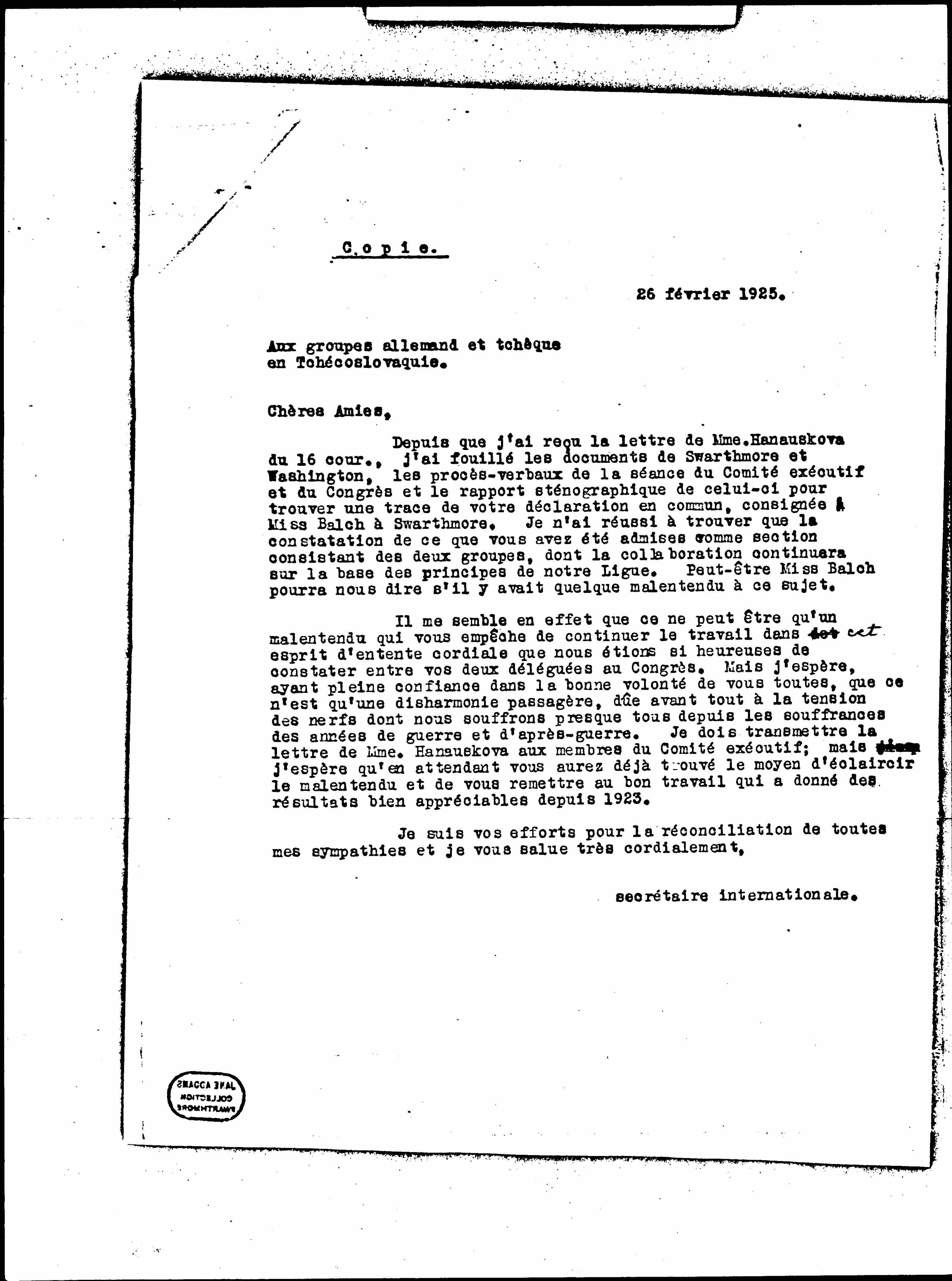Since I received the letter from Mrs. Hanauskova of the 16th court, I have searched the documents of Swarthmore and Washington, the minutes of the meeting of the Executive Committee and of Congress and the stenographic report thereof for find a record of your joint declaration, recorded Miss Balch at Swarthmore. I only managed to find the statement that you have been admitted as a section consisting of the two groups, whose collaboration will continue on the basis of the principles of our League. Perhaps Miss Balch can tell us if there was any misunderstanding about it.