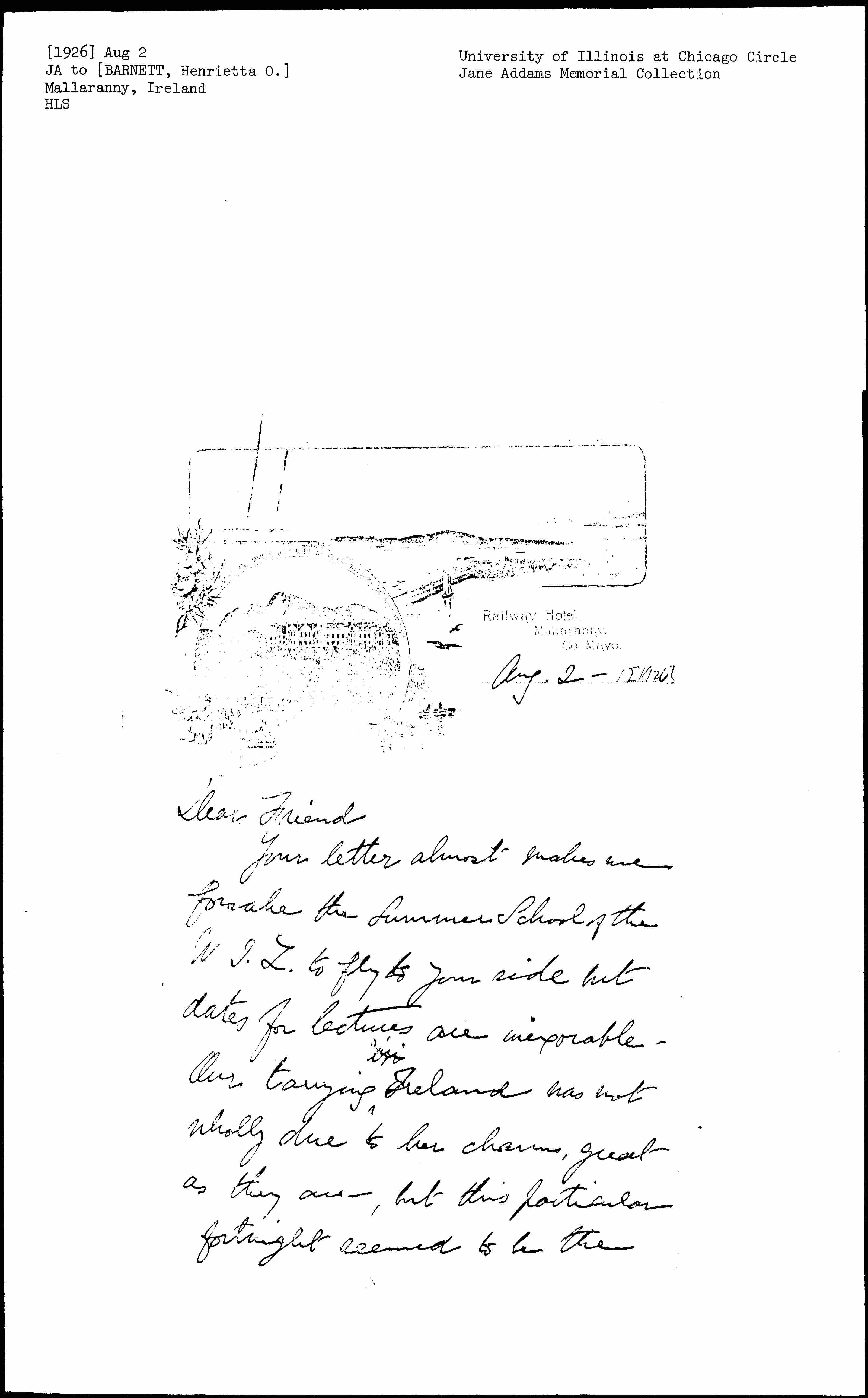 Your letter almost makes me forsake the Summer School of the W.I.L to fly to your side but dates for lectures are inexorable. Our tarrying ↑in↓ Ireland has not wholly due to her charms, great as they are, but this particular fortnight seemed to be the [page 2] only chance for recovery from the strain of the International Congress.