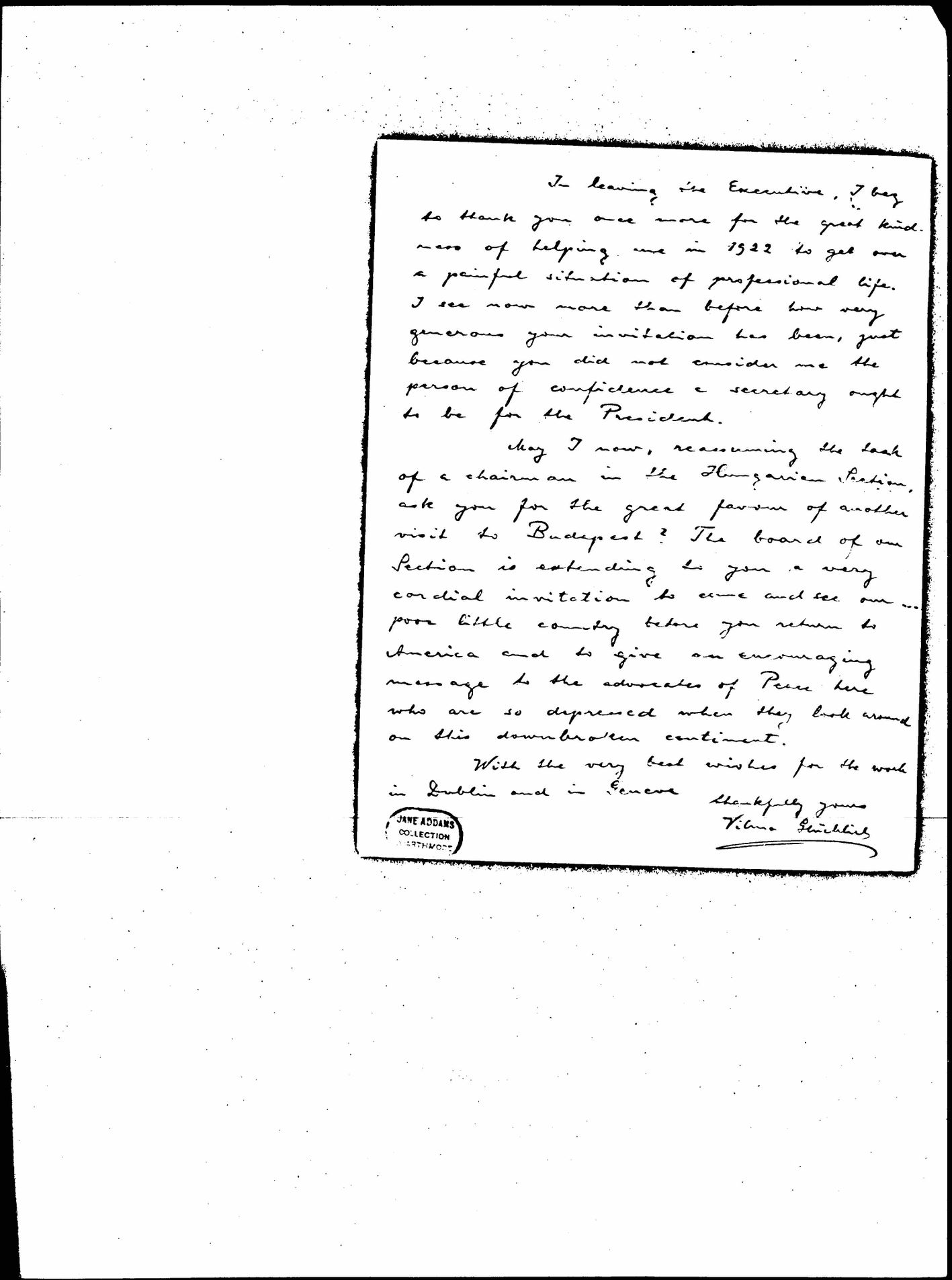 May I now, reassuming the task of a chairman in the Hungarian Section, ask you for the great [favor] of another visit to Budapest? The board of our Section is extending to you a very cordial invitation to come and see our poor little country before you return to America and to give an encouraging message to the advocates of Peace here who are so depressed when they look around on this down broken continent.