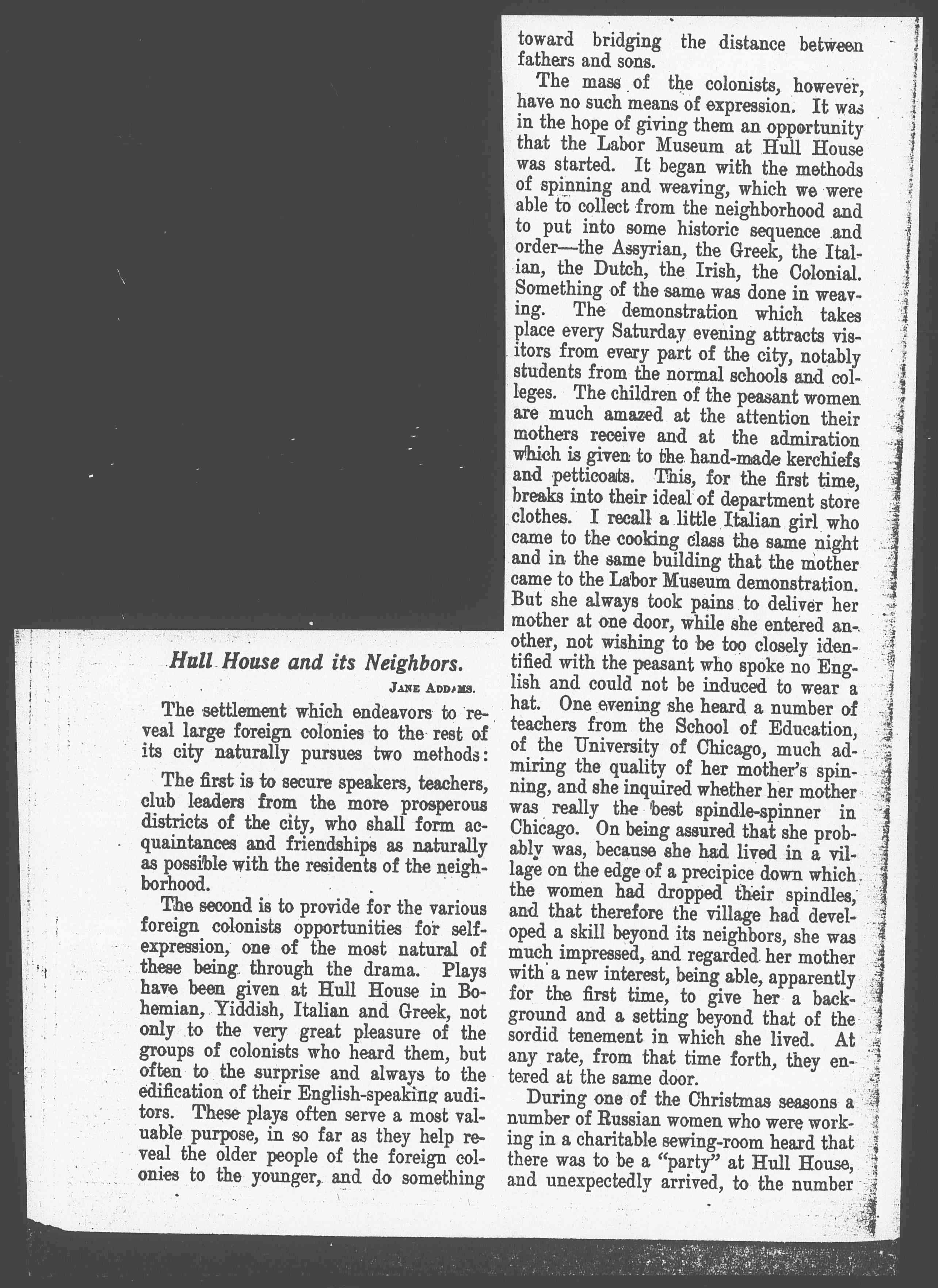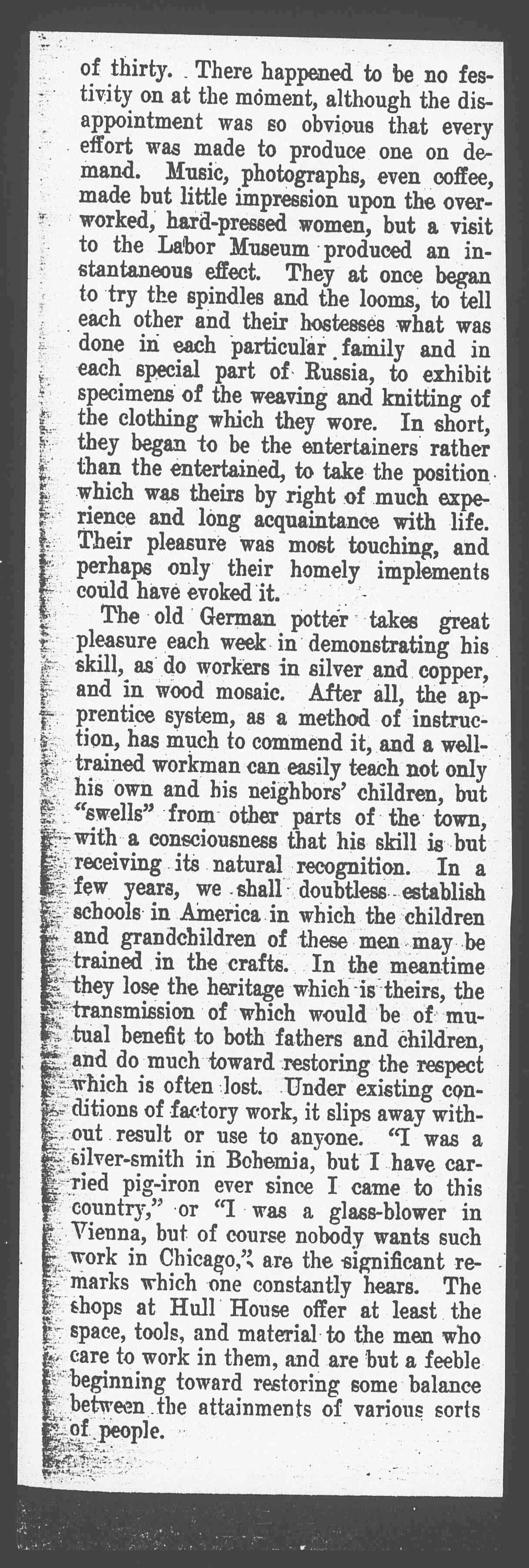 During one of the Christmas seasons a number of Russian women who were working in a charitable sewing-room heard that there was to be a "party" at Hull House, and unexpectedly arrived, to the number [page 2] of thirty. There happened to be no festivity on at the moment, although the disappointment was so obvious that every effort was made to produce one on demand. Music, photographs, even coffee, made but little impression upon the overworked, hard-pressed women, but a visit to the Labor Museum produced an instantaneous effect. They at once began to try the spindles and the looms, to tell each other and their hostesses what was done in each particular family and in each special part of Russia, to exhibit specimens of the weaving and knitting of the clothing which they wore. In short, they began to be the entertainers rather than the entertained, to take the position which was theirs by right of much experience and long acquaintance with life. Their pleasure was most touching, and perhaps only their homely implements could have evoked it.