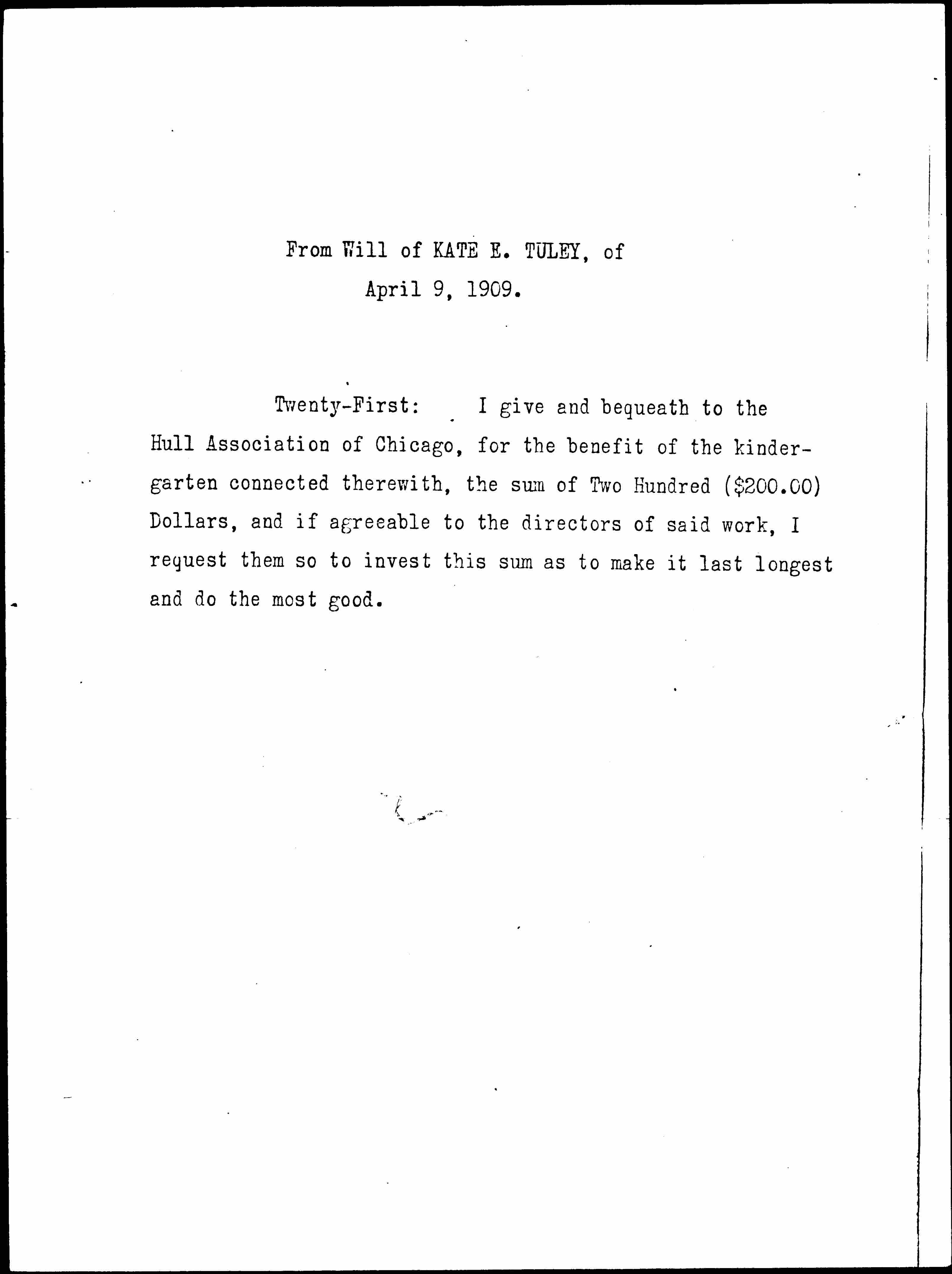 Twenty-First: I give and bequeath to the Hull Association of Chicago, for the benefit of the kindergarten connected therewith, the sum of Two Hundred ($200.00) Dollars, and if agreeable to the directors of said work, I request them so to invest this sum as to make it last longest and do the most good.