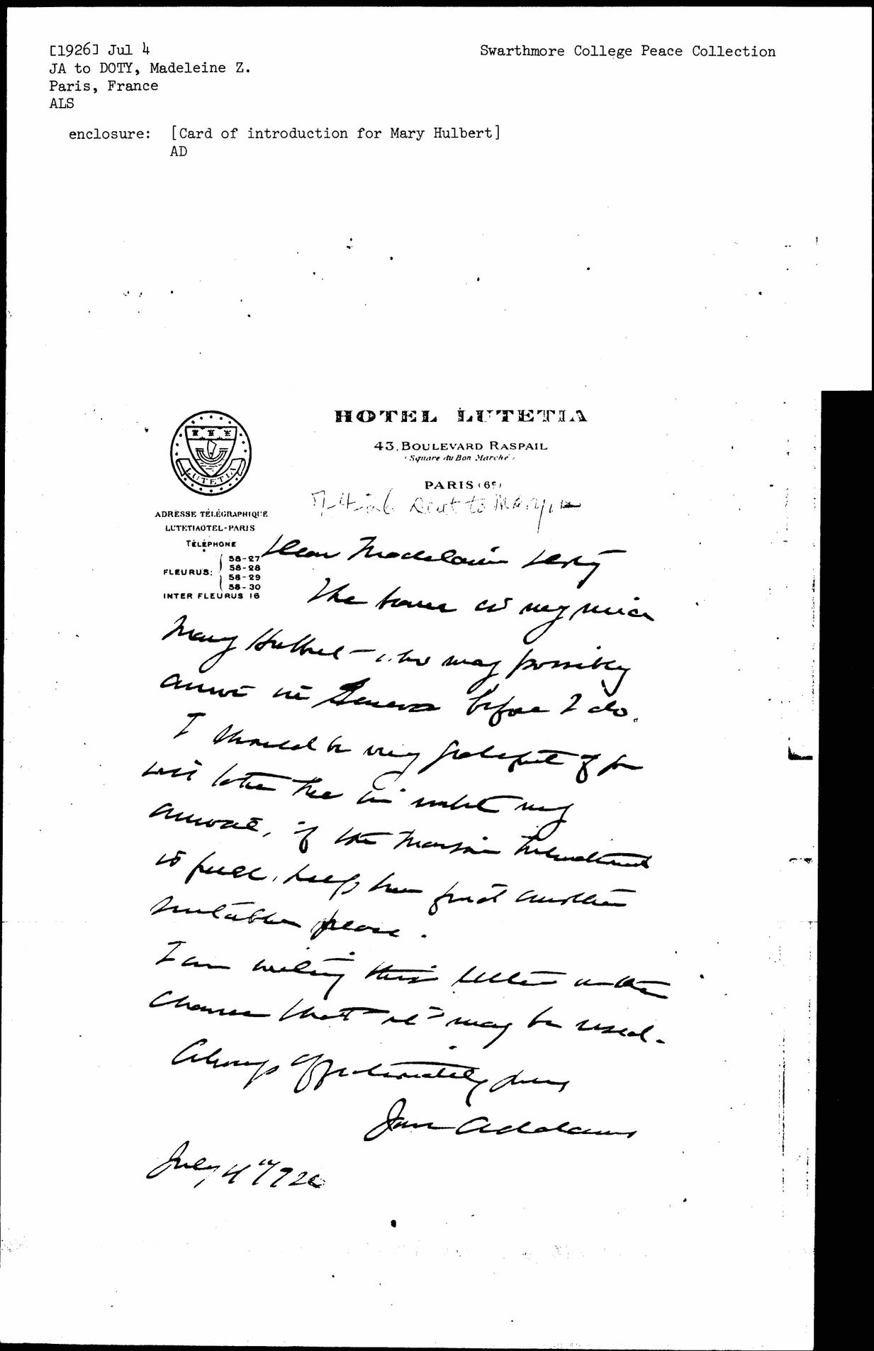 The bearer is my niece Mary Hulbert who may possibly arrive in Geneva before I do.