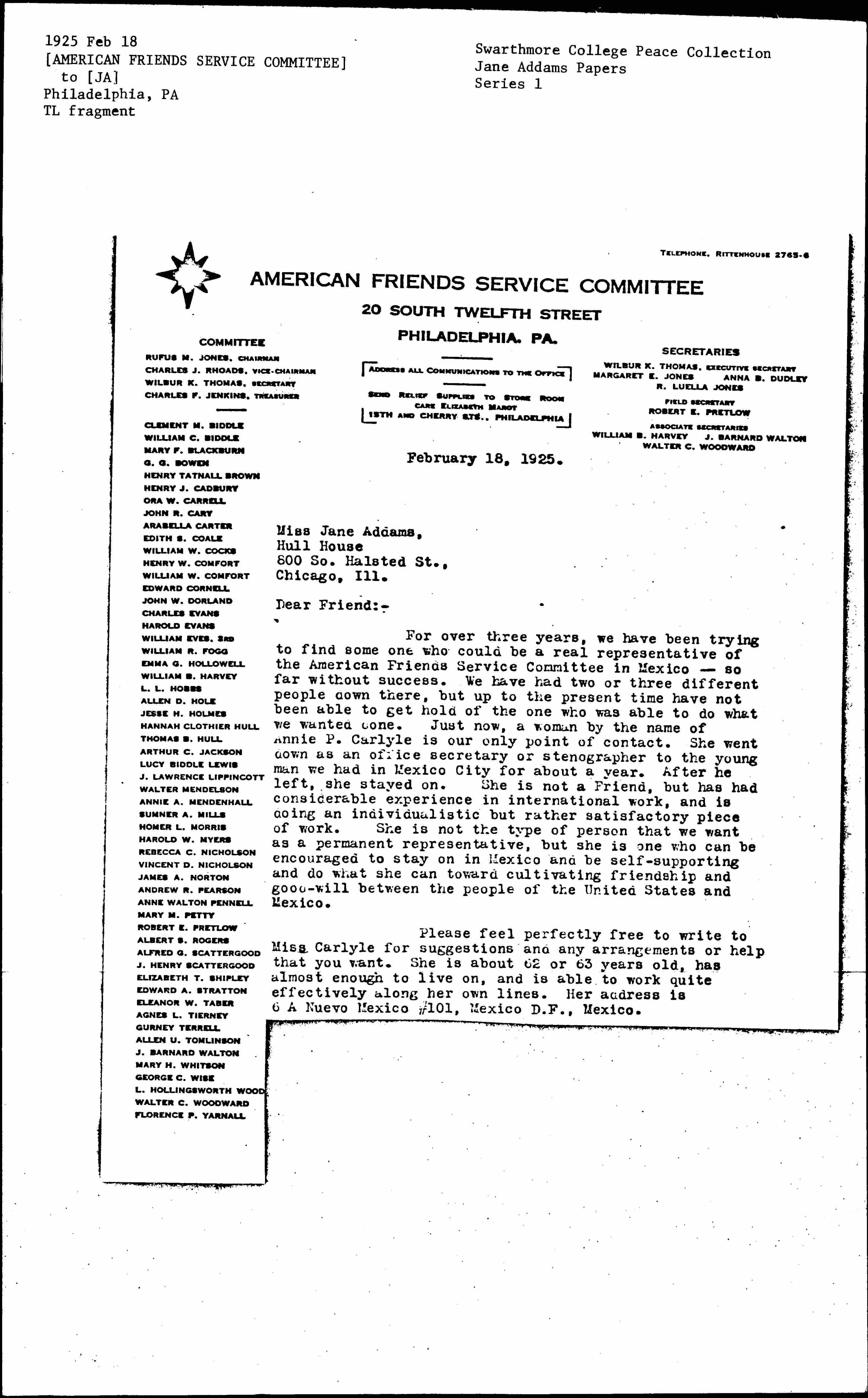 For over three years, we have been trying to find some one who could be a real representative of the American Friends Service Committee in Mexico -- so far without success. We have had two or three different people down there, but up to the present time have not been able to get hold of the one who was able to do what we wanted done. Just now, a woman by the name of Annie P. Carlyle is our only point of contact. She went down as an office secretary or stenographer to the young man we had in Mexico City for about a year. After he left, she stayed on. She is not a Friend, but has had considerable experience in international work, and is doing an individualistic but rather satisfactory piece of work. She is not the type of person that we want as a permanent representative, but she is one who can be encouraged to stay on in Mexico and be self-supporting and do what she can toward cultivating friendship and good-will between the people of the United States and Mexico.