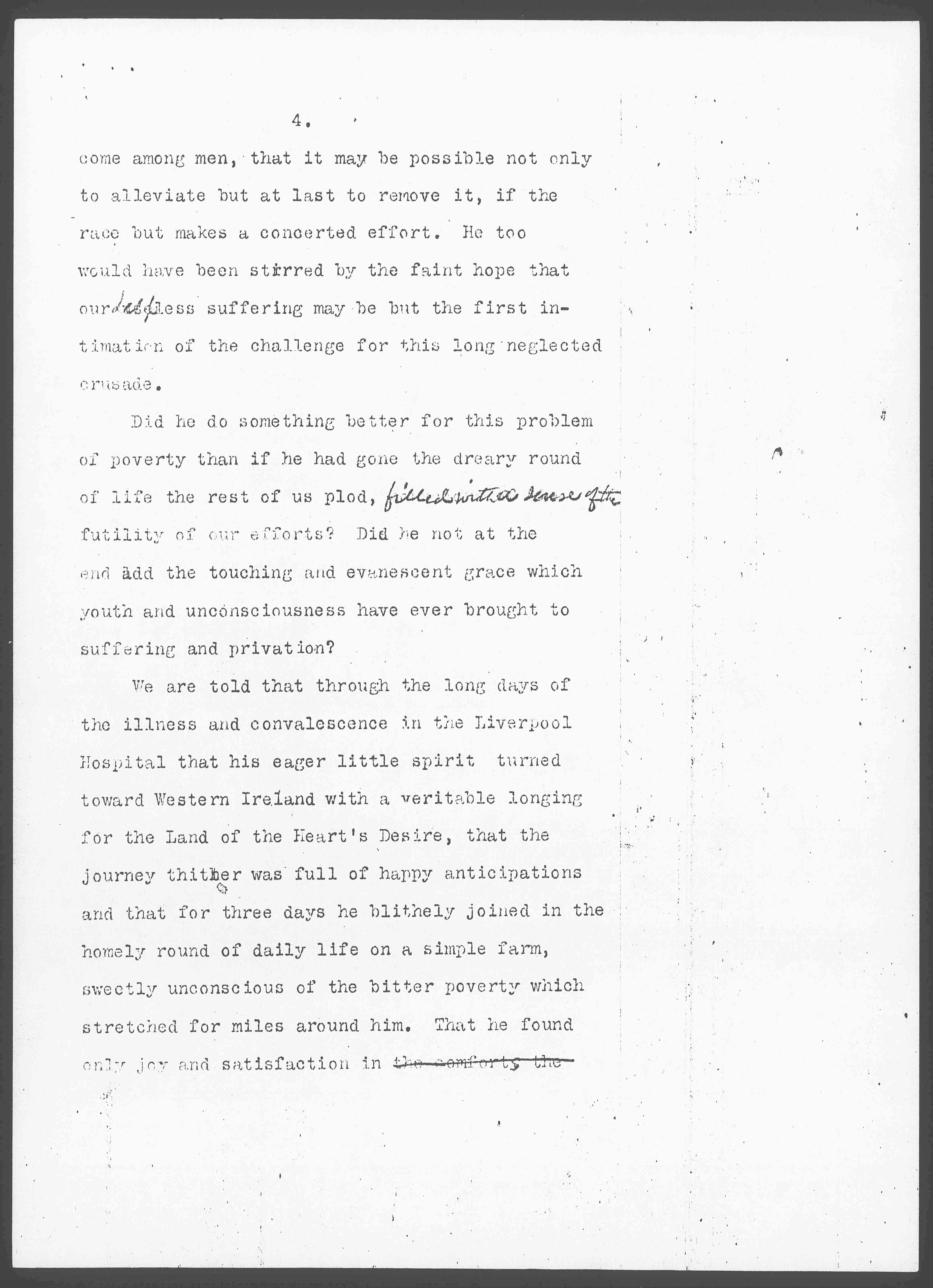 Did he do something better for this problem of poverty than if he had gone the dreary round of life the rest of us plod, [illegible words] ↑filled with a sense of the↓ futility of our efforts? Did he not at the end add the touching and evanescent grace which youth and unconsciousness have ever brought to suffering and privation?