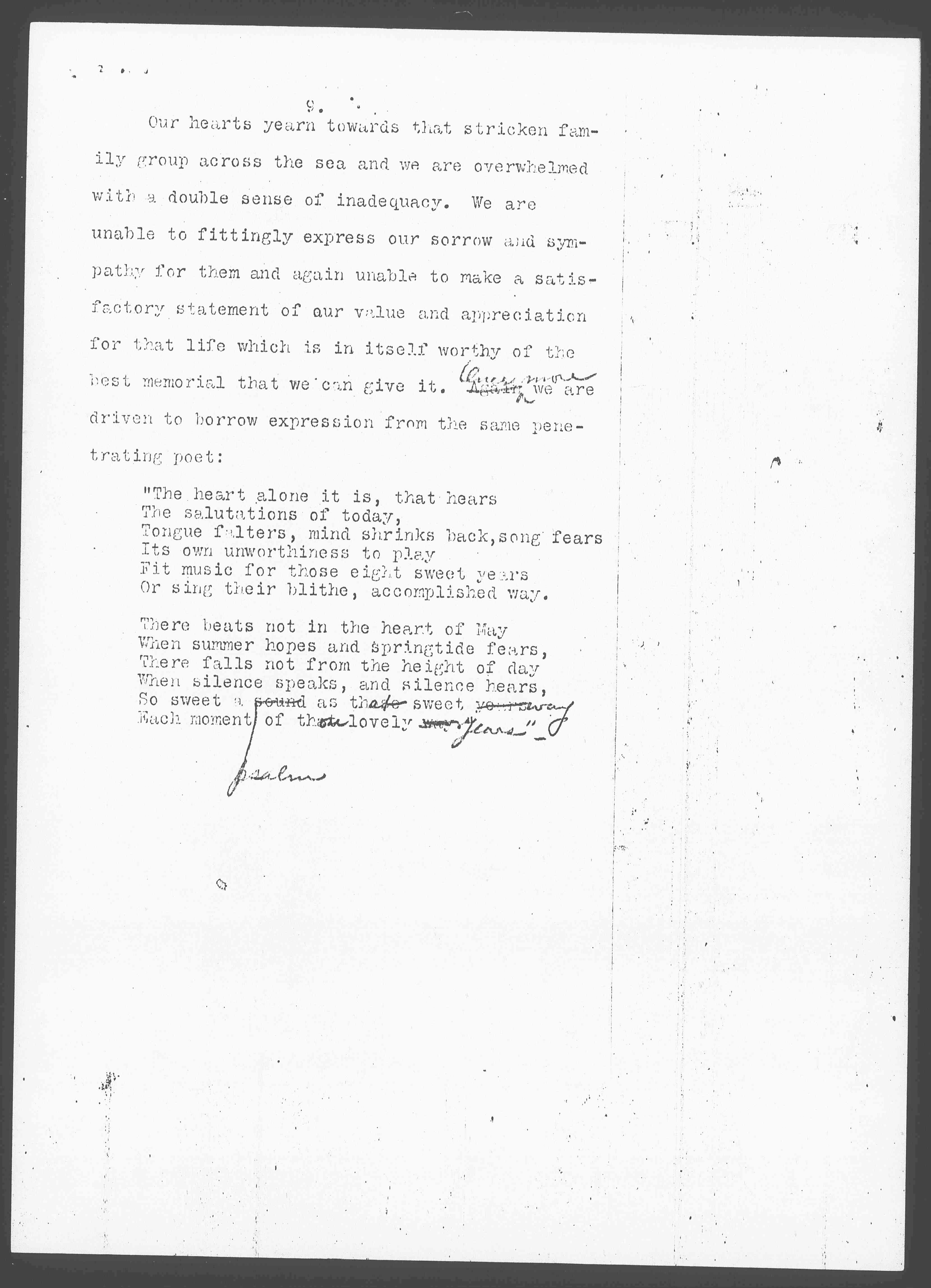 Our hearts yearn toward that stricken family group across the sea and we are overwhelmed with a double sense of inadequacy. We are unable to fittingly express our sorrow and sympathy for them and again unable to make a satisfactory statement of our value and appreciation for that life which is in itself worthy of the best memorial that we can give it. Again ↑Once more↓ we are driven to borrow expression from the same penetrating poet: