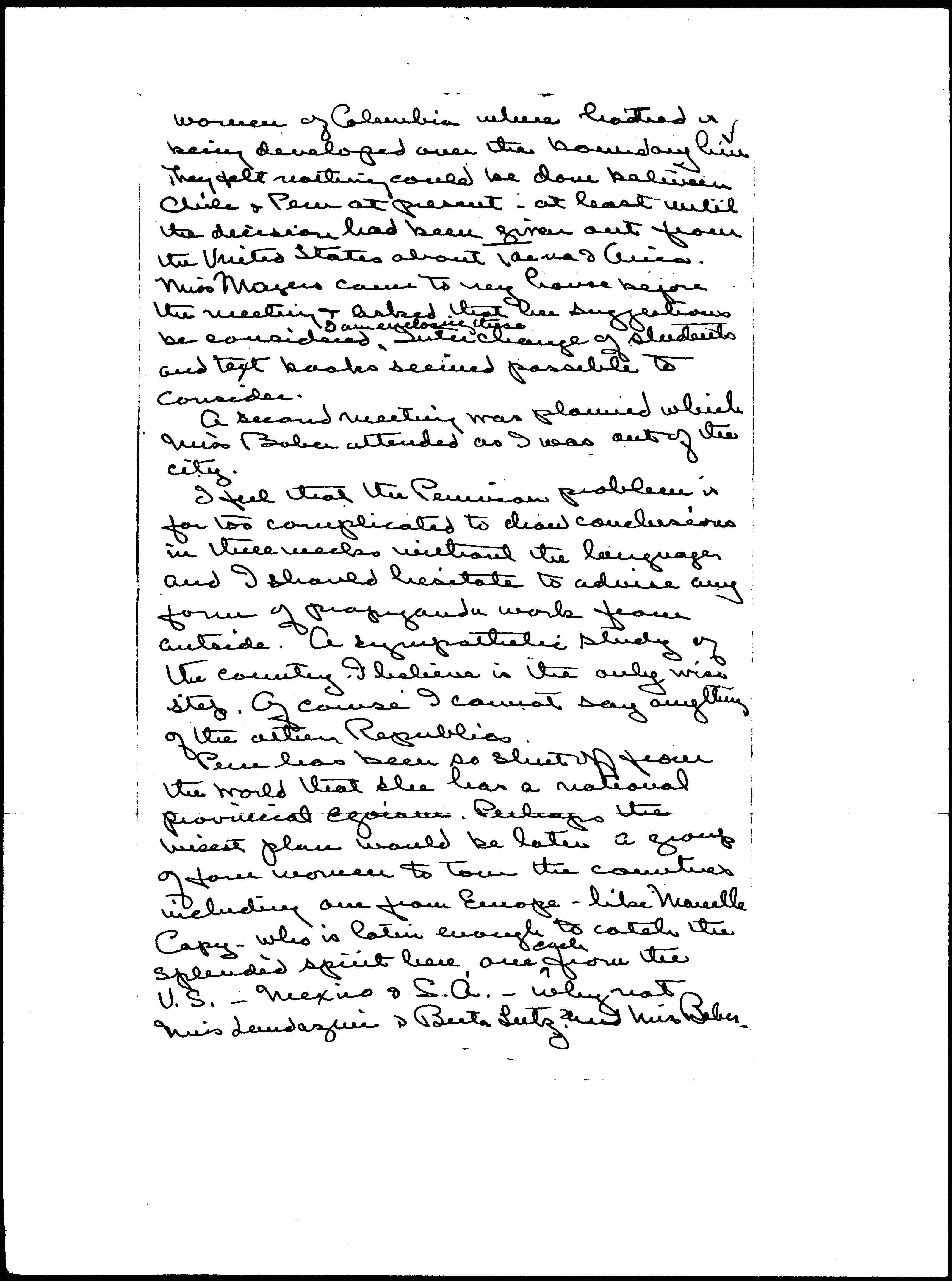 They voted to work this winter for closer [illegible] with the [page 4] women of Columbia where [illegible] is being developed over the boundary line. They felt nothing could be done between Chile & Peru at present -- at least until the decision had been given out from the United States about Tacna & Arica. Miss [Mayer] came to my house before the meeting & asked that her suggestions be considered ↑I am enclosing those↓. Interchange of students and text books seemed possible to consider.