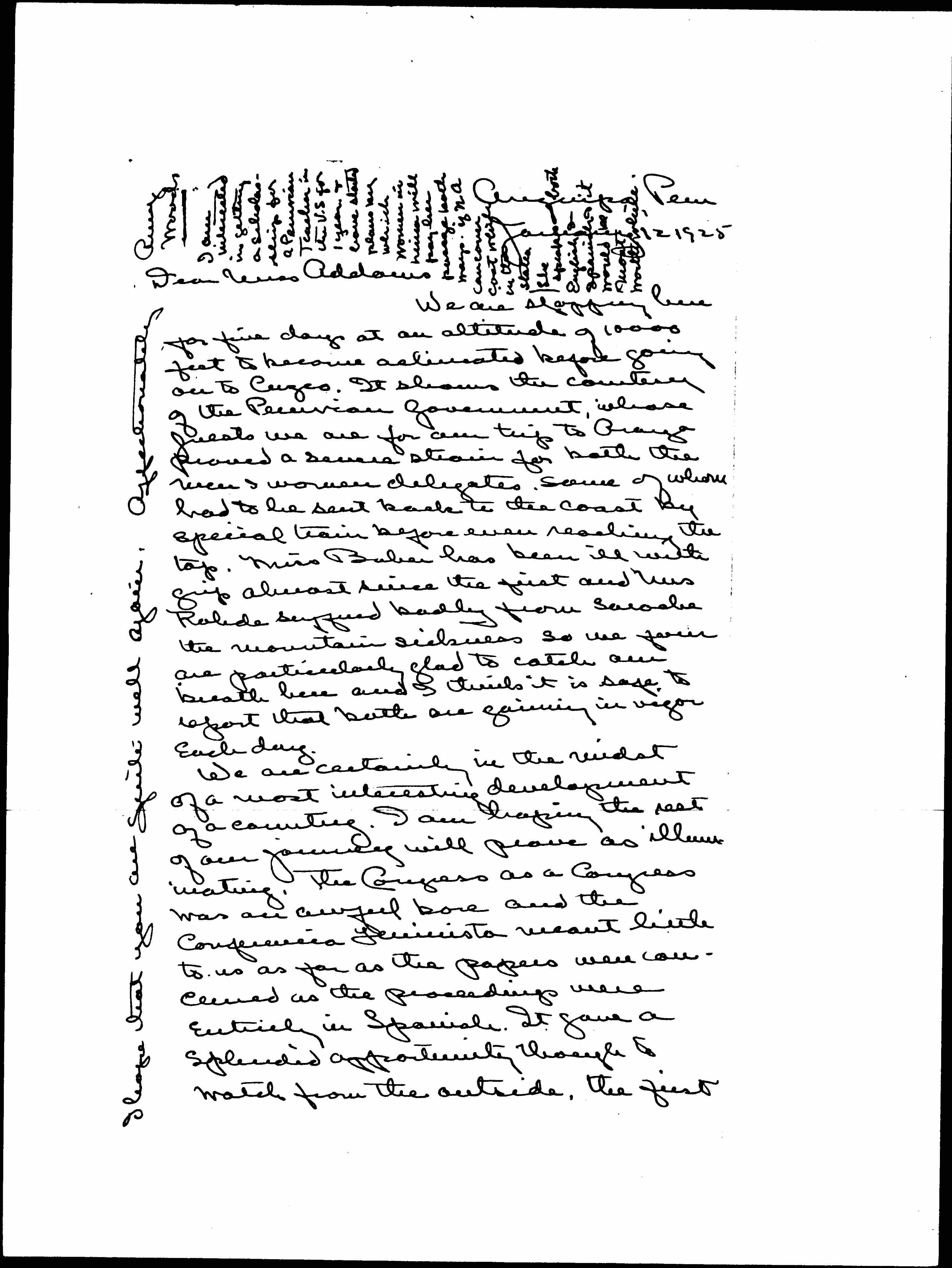 We are stopping here for five days at an altitude of 10000 feet to become acclimated before going on to Cuzco. It shows the courtesy of the Peruvian government, whose guests we are for our trip to Oroya proved a severe strain for both the men & women delegates, some of whom had to be sent back to the coast by special train before even reaching the top. Miss Baber has been ill with [grippe] almost since the first and Mrs Rohde suffered badly from soroche the mountain sickness so we four are particularly glad to catch our breath here and I think it is safe to report that both are gaining in vigor each day.