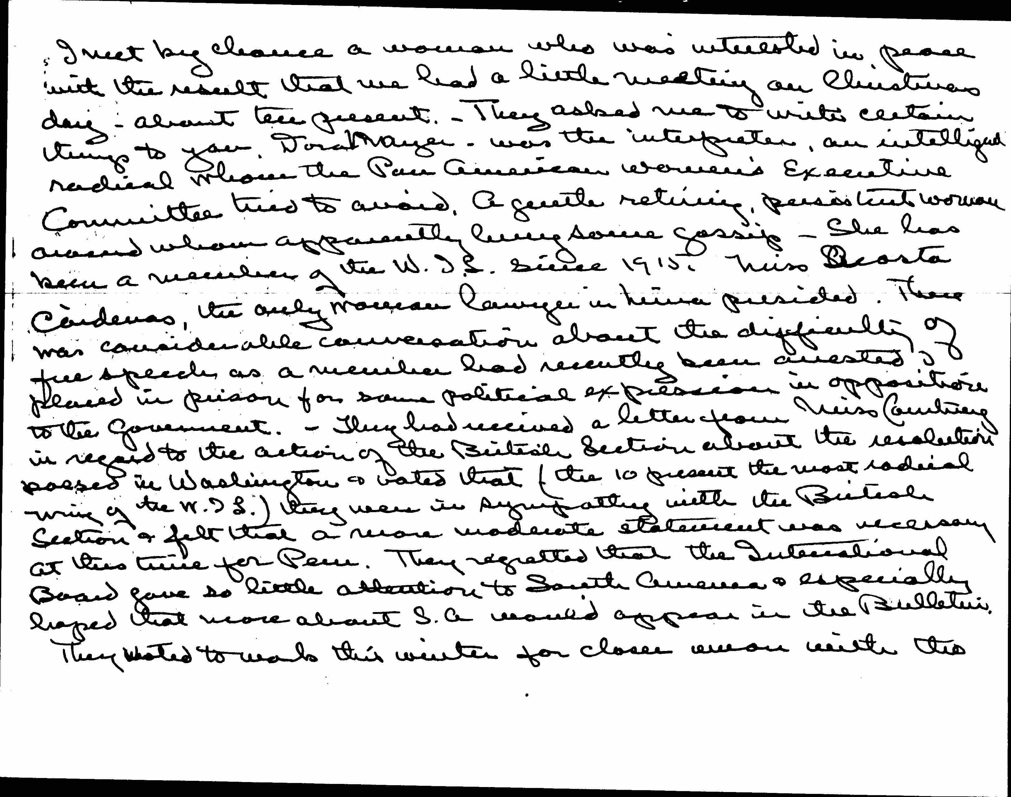 I met by chance a woman who was interested in peace with the result that we had a little meeting on Christmas day -- about ten present. They asked me to write certain things to you. Dora Mayer -- was the interpreter, an intelligent radical whom the Pan American Women's Executive Committee tried to avoid, a gentle retiring, persistent woman around whom apparently hung some gossip -- she has been a member of the W.I.L. since 1915. Miss Acosta Cárdenas, the only woman lawyer in Lima presided. There was considerable conversation about the difficulty of free speech as a member had recently been arrested & placed in prison for some political expression in opposition to the government. They had received a letter from Miss Courtney in regard to the action of the British Section about the resolution passed in Washington & voted that (the 10 present the most radical wing of the W.I.L.) they were in sympathy with the British Section & felt that a more moderate statement was necessary at the time for Peru. They regretted that the International Board gave so little attention to South America & especially hoped that more about S.A. would appear in the Bulletin.