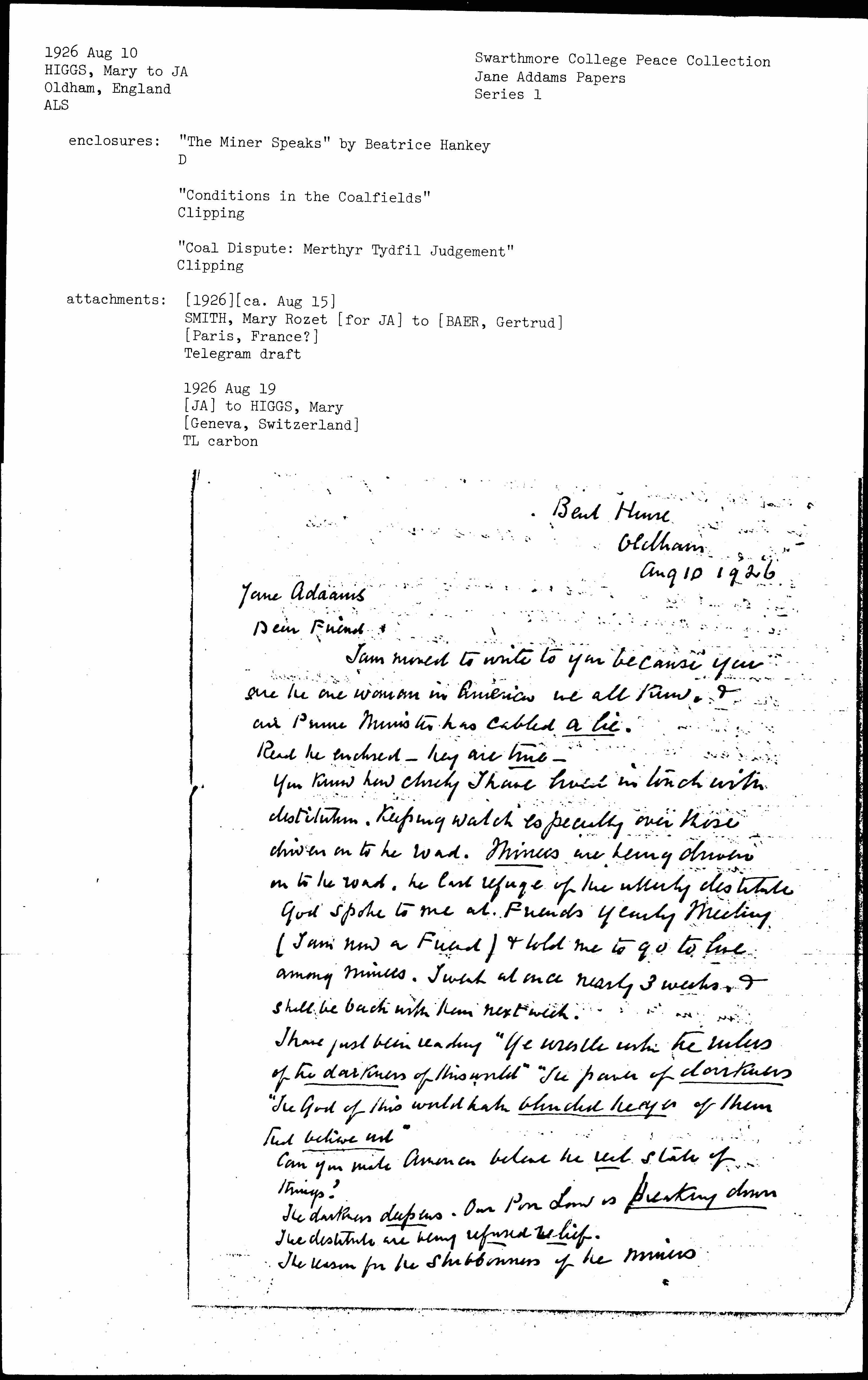 You know how closely I have [held] in touch with destitution. Keeping watch especially on those driven on to the road. Miners are being driven on to the road. [The] last refuge of the utterly destitute. God spoke to me at Friends' Yearly Meeting, ( I am now a Friend) & told me to go to live among miners. I went at once nearly 3 weeks, & shall be back with them next week.