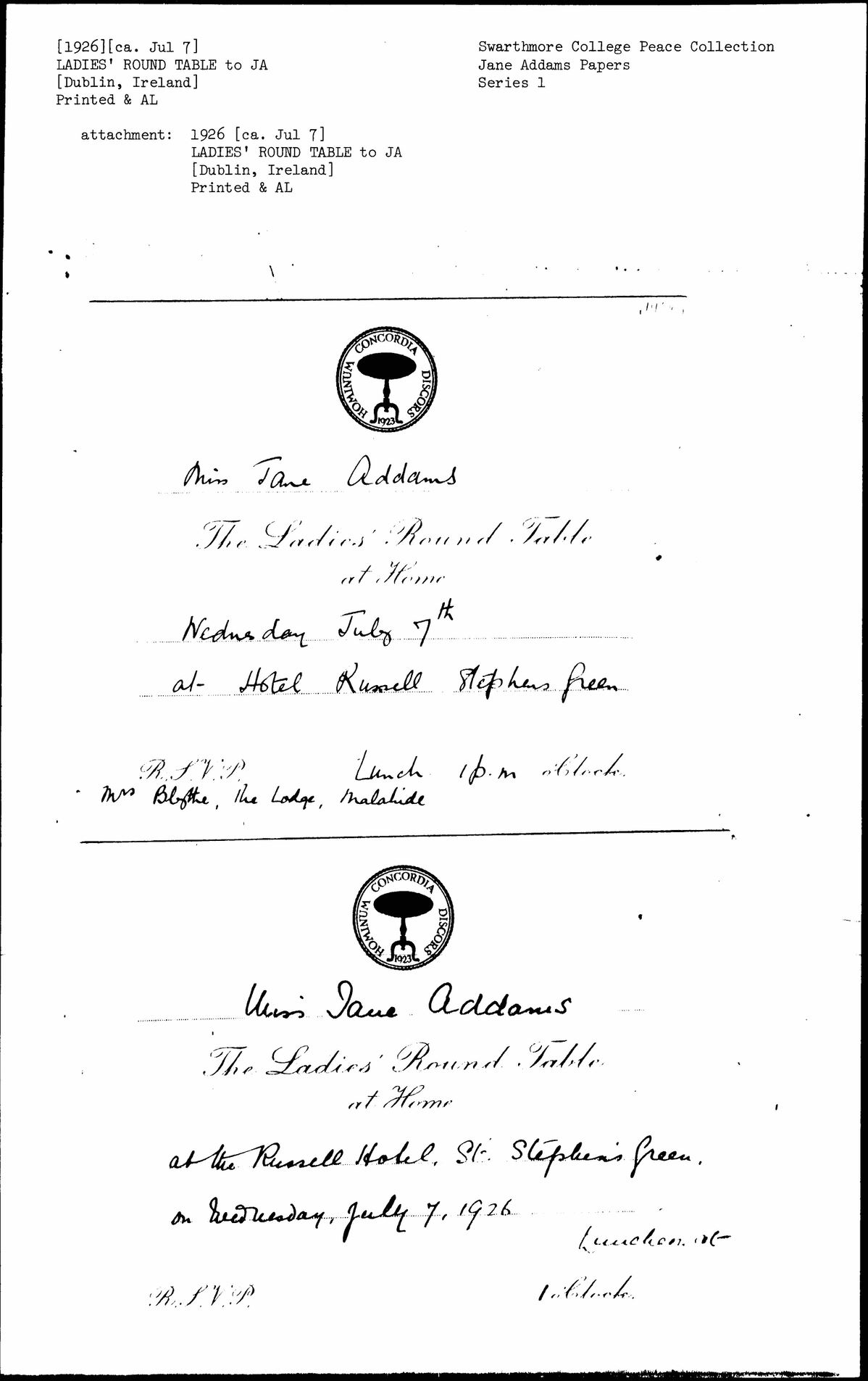 ↑at the Russell Hotel, St. Stephen's Green, on Wednesday, July 7, 1926↓