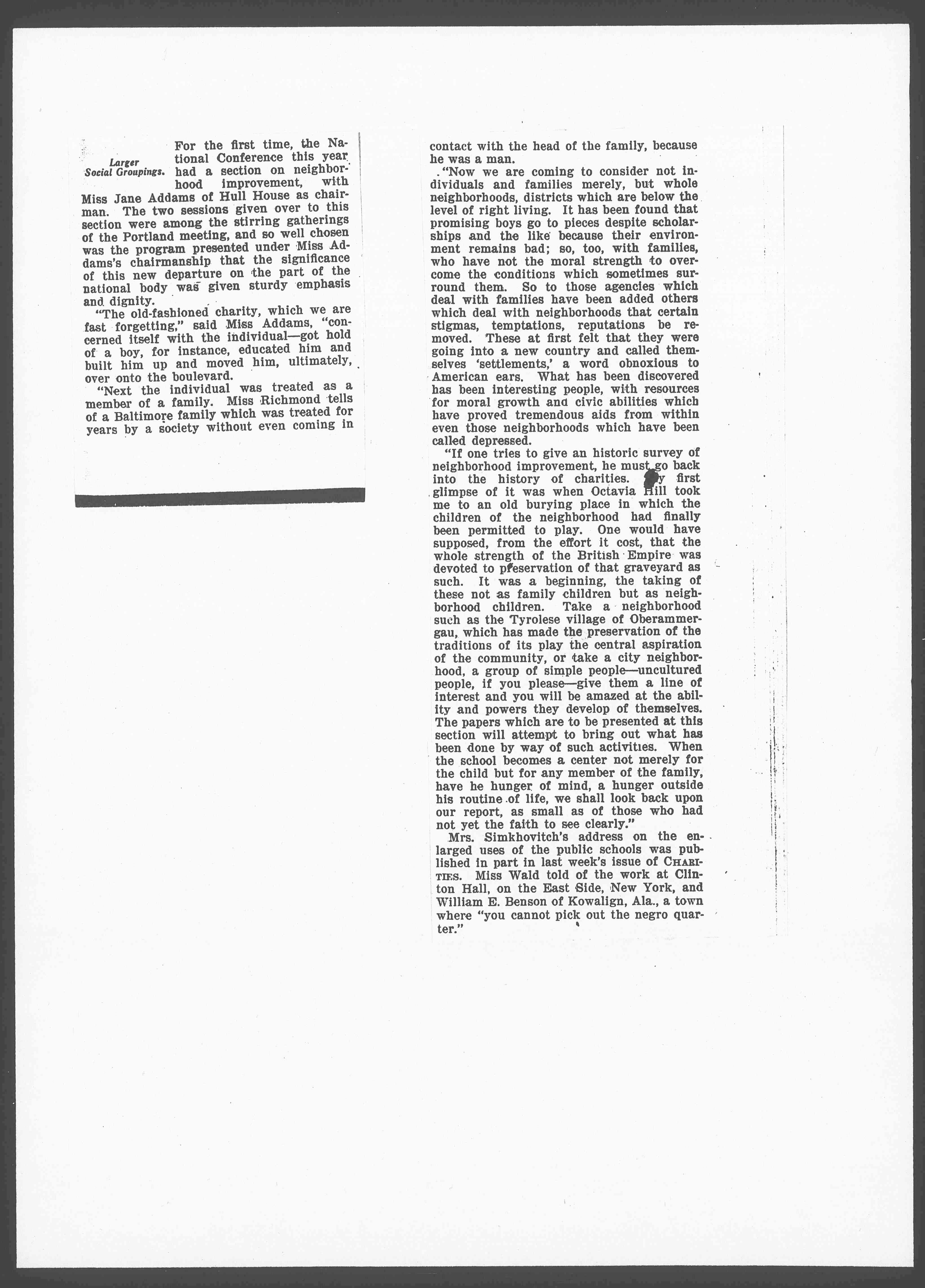 Mrs. Simkhovitch's address on the enlarged uses of the public schools was published in part in last week's issue of CHARITIES. Miss Wald told of the work at Clinton Hall, on the East Side, New York, and William E. Benson of [Kowaliga], Ala., a town where "you cannot pick out the negro quarter."