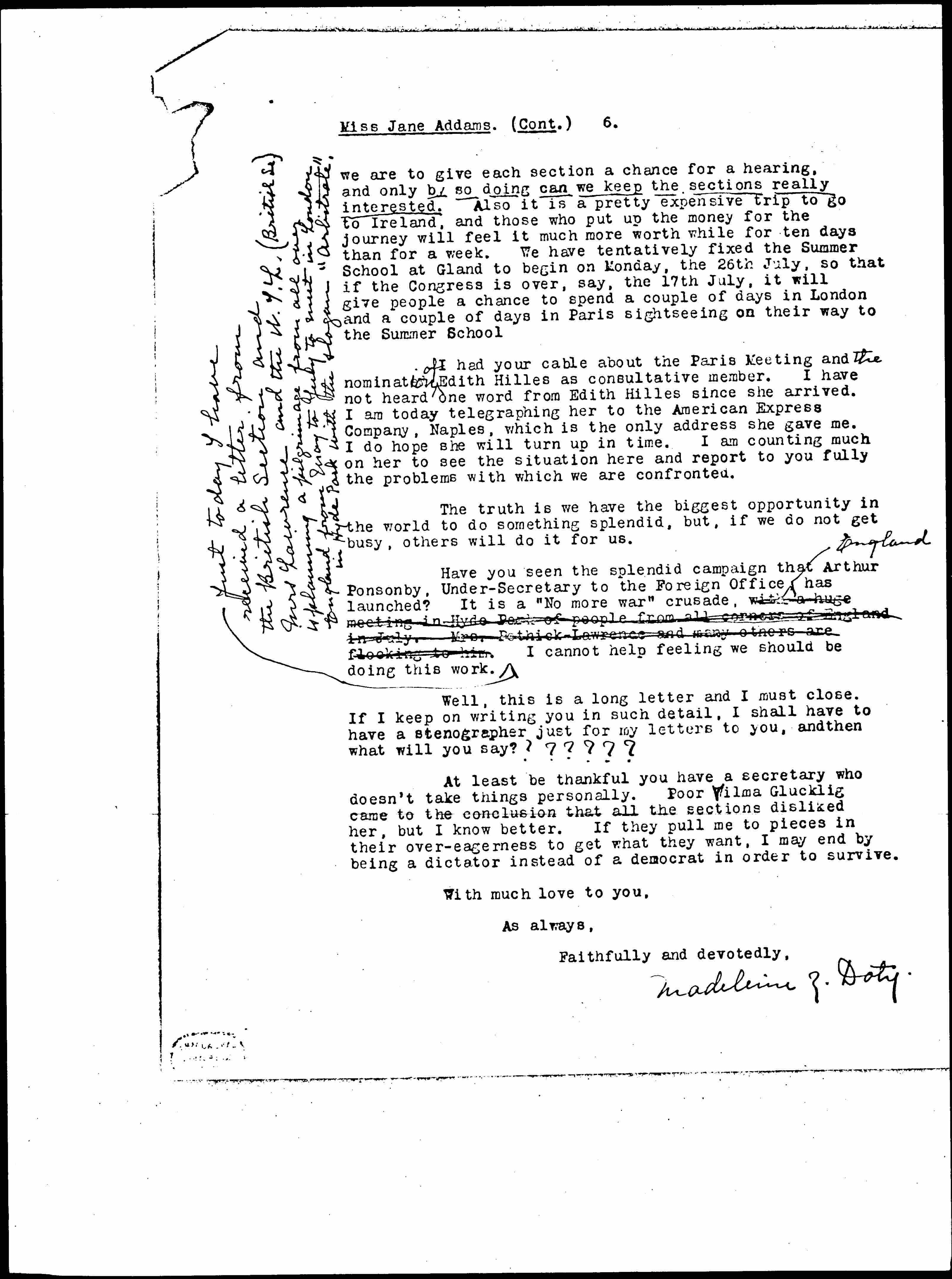 Have you seen the splendid campaign that Arthur Ponsonby, [Undersecretary] to the Foreign Office ↑England↓ has launched? It is a "No more war" crusade, with a huge meeting in Hyde Park of people from all corners of England in July. Mrs. Pethick Lawrence and many others are flocking to him. ↑Just today I have received a letter from the British Section and Mrs. Lawrence and the W.I.L. (British Se.) is planning a pilgrimage from all over England from May to July to meet in London in Hyde Park with the slogan "Arbitrate."↓ I cannot help feeling we should be doing this work.