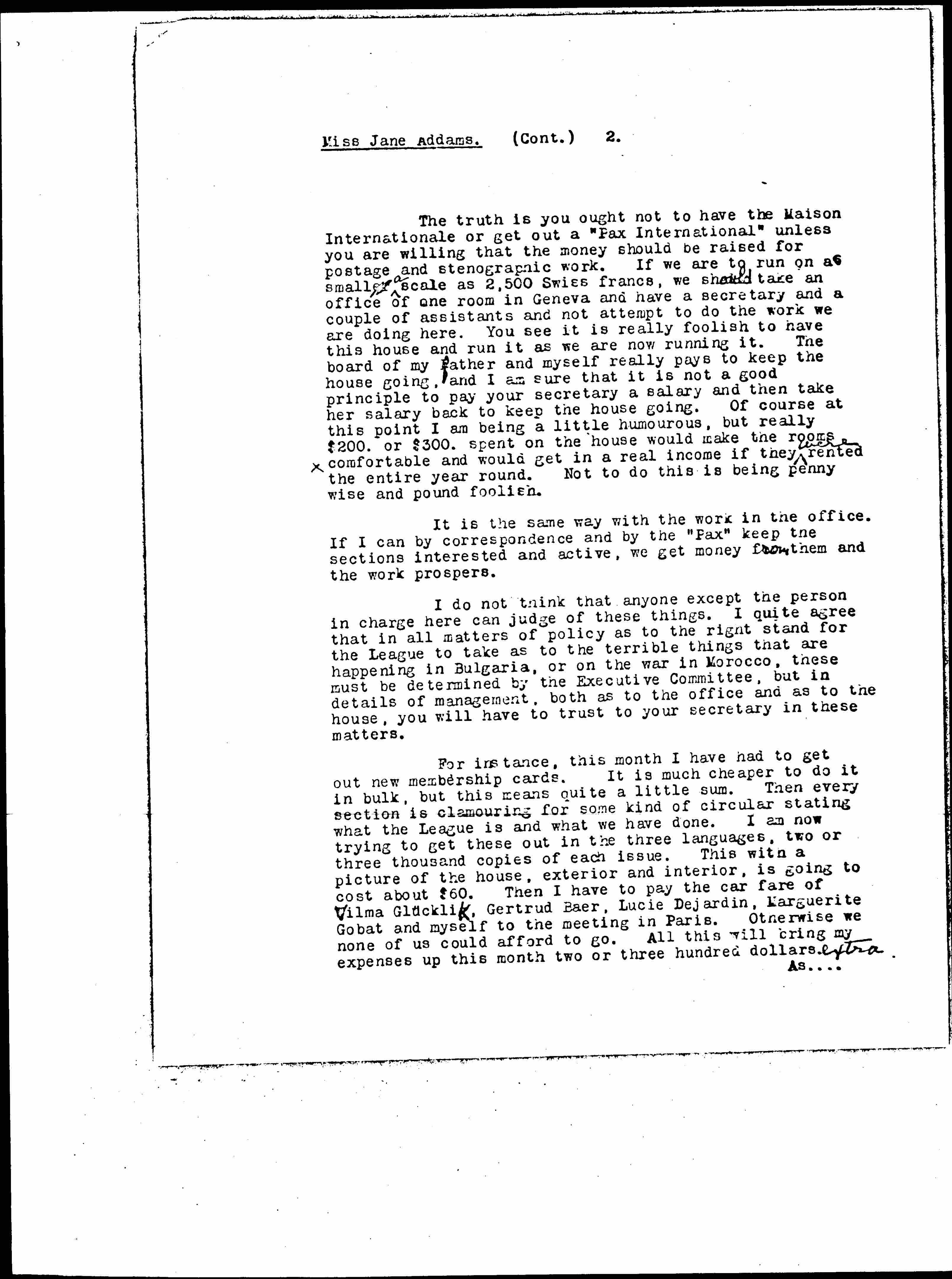 The truth is you ought not to have the Maison Internationale or get out a "Pax International" unless you are willing that the money should be raised for postage and stenographic work. If we are to run on a smaller ↑a↓ scale as 2,500 Swiss francs, we should take an office of one room in Geneva and have a secretary and a couple of assistants and not attempt to do the work we are doing here. You see it is really foolish to have this house and run it as we are now running it. The board of my father and myself really pays to keep the house going, and I am sure that it is not a good principle to pay your secretary a salary and then take her salary back to keep the house going. Of course at this point I am being a little humourous, but really $200. or $300. spent on the house would make the rooms comfortable and would get in a real income if they ↑were↓ rented the entire year round. Not to do this is being penny wise and pound foolish.
