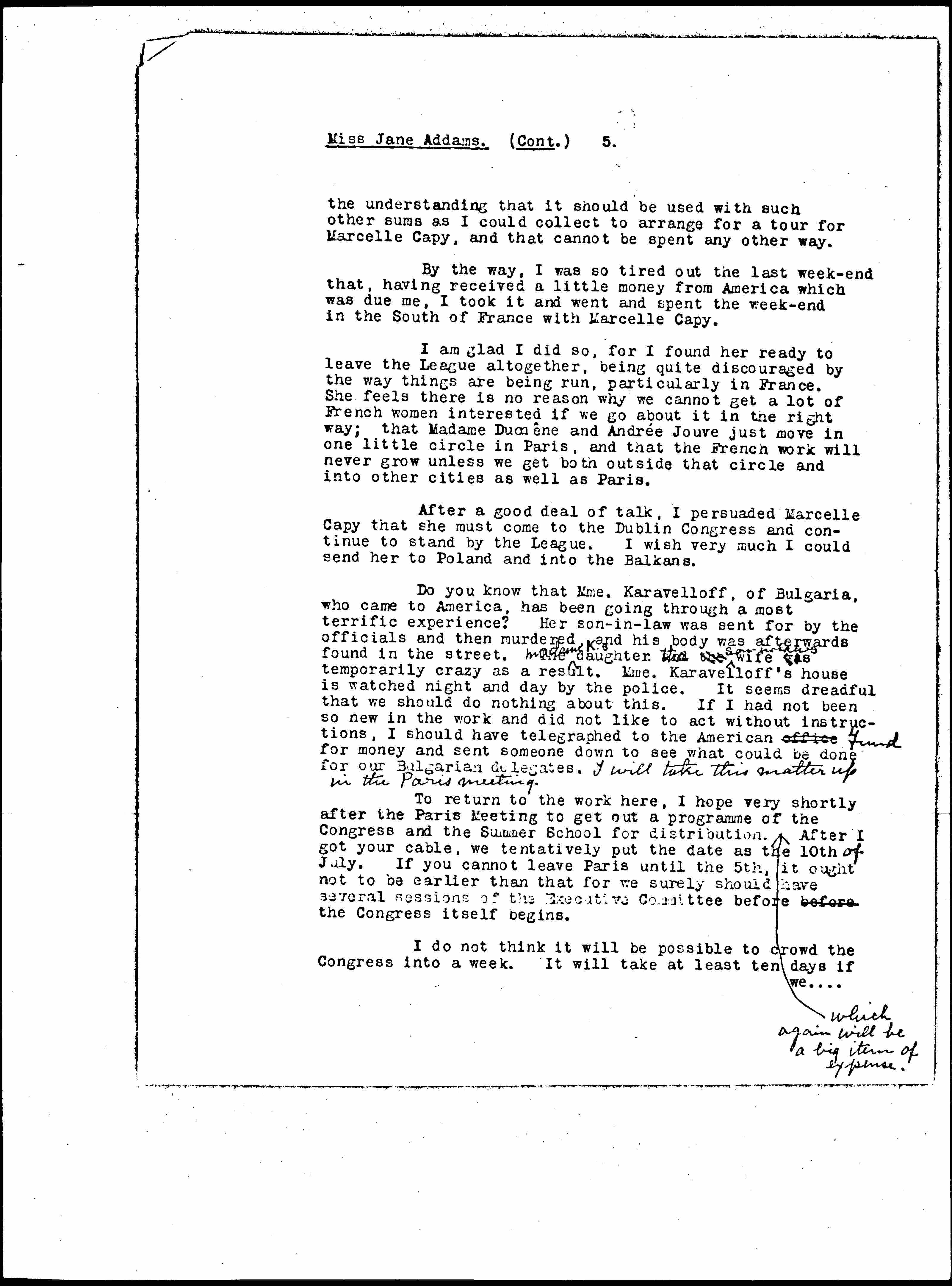 Do you know that Mme. Karavelloff, of Bulgaria, who came to America, has been going through a most terrific experience? Her son-in-law was sent for by the officials and then murdered and his body was afterwards found in the street. ↑Madame K.'s↓ daughter. The and the ↑son's brothers↓ wife [is] temporarily crazy as a result. Mme. Karavelloff's house is watched night and day by the police. It seems dreadful that we should do nothing about this. If I had not been so new in the work and did not like to act without instructions, I should have telegraphed to the American office ↑Fund↓ for money and sent someone down to see what could be done for our Bulgarian delegates. ↑I will take this matter up in the Paris meeting.↓