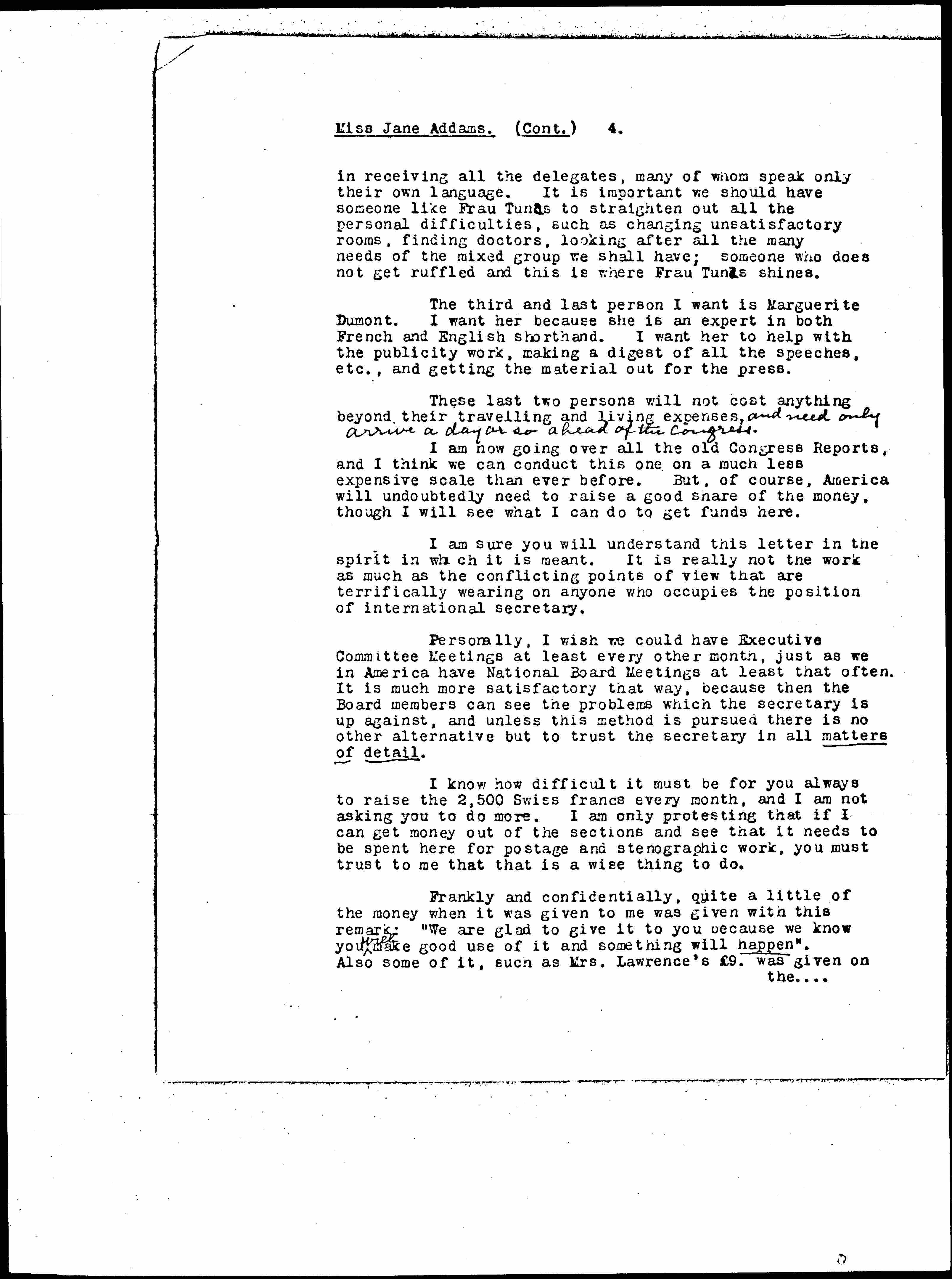 For instance, this month I have had to get out new membership cards. It is much cheaper to do it in bulk, but this means quite a little sum. Then every section is [clamoring] for some kind of circular stating what the League is and what we have done. I am now trying to get these out in the three languages, two or three thousand copies of each issue. This with a picture of the house, exterior and interior, is going to cost about $60. Then I have to pay the car fare of Vilma [Glucklich], Gertrud Baer, Lucie Dejardin, Marguerite Gobat and myself to the meeting in Paris. Otherwise we none of us could afford to go. All this will bring my expenses up this month two or three hundred dollars extra. [page 3] As I indicated in the expense account I sent you, with the regular monthly amount you send me ↑2,500 Swiss fr.↓ and with what I have raised, I have enough to carry me for six months, but there will certainly not be enough to hand over money for the Dublin Congress as Mme. Ramondt-Hirschmann suggests. ↑I intend to send out a special appeal for funds for the Congress. We will bring this up in Paris.↓