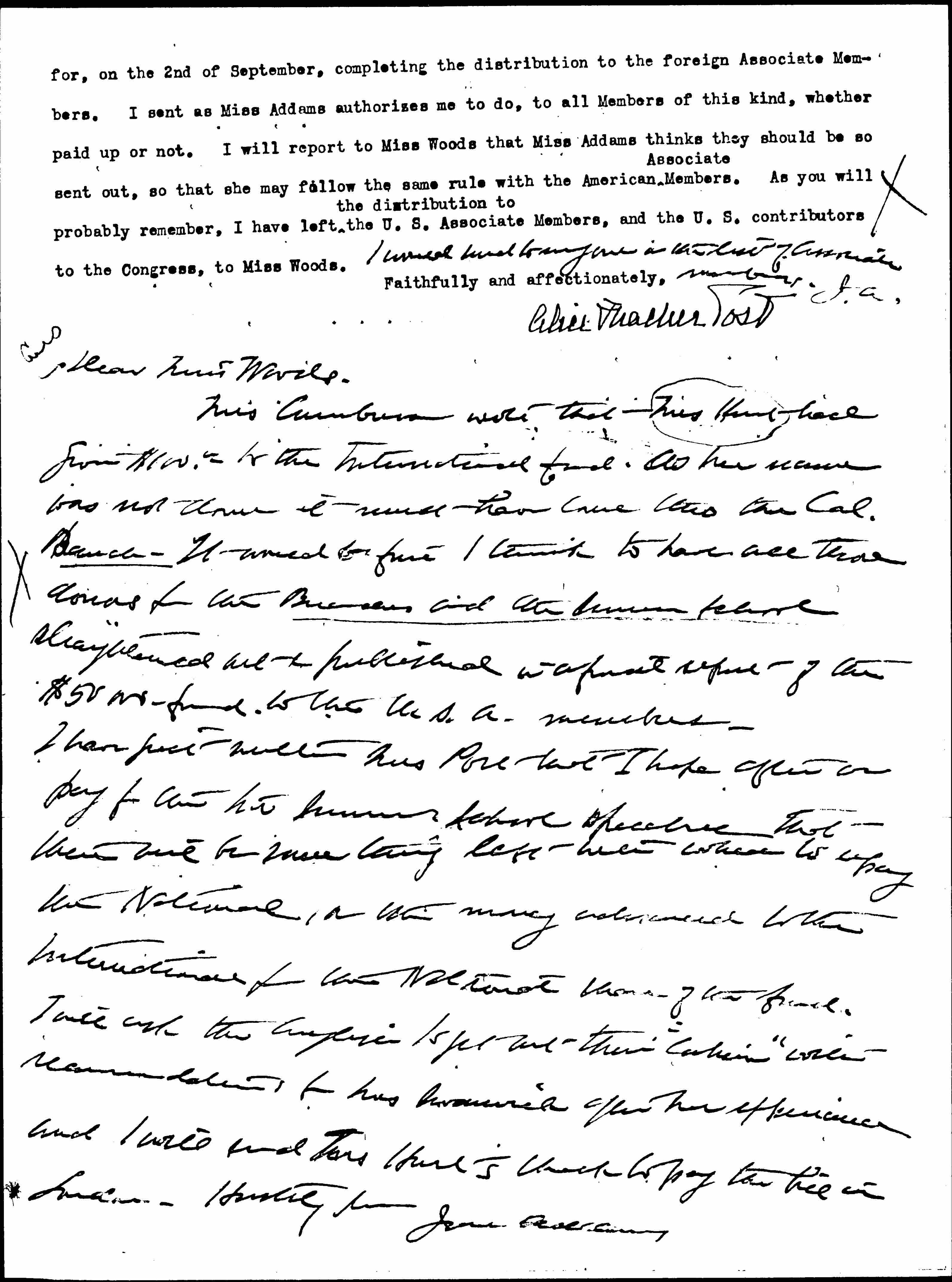 I have just written Mrs Post that I hope after we pay for the two Summer School speeches that there will be something left with which to repay the National, or the money advanced to the International from the National [share] of the fund. I will ask the English to get out their "cahier" with recommendations for Mrs Swanwick after her experience and I will send Mrs [Kent's] check to pay the bill in London. Hastily yours