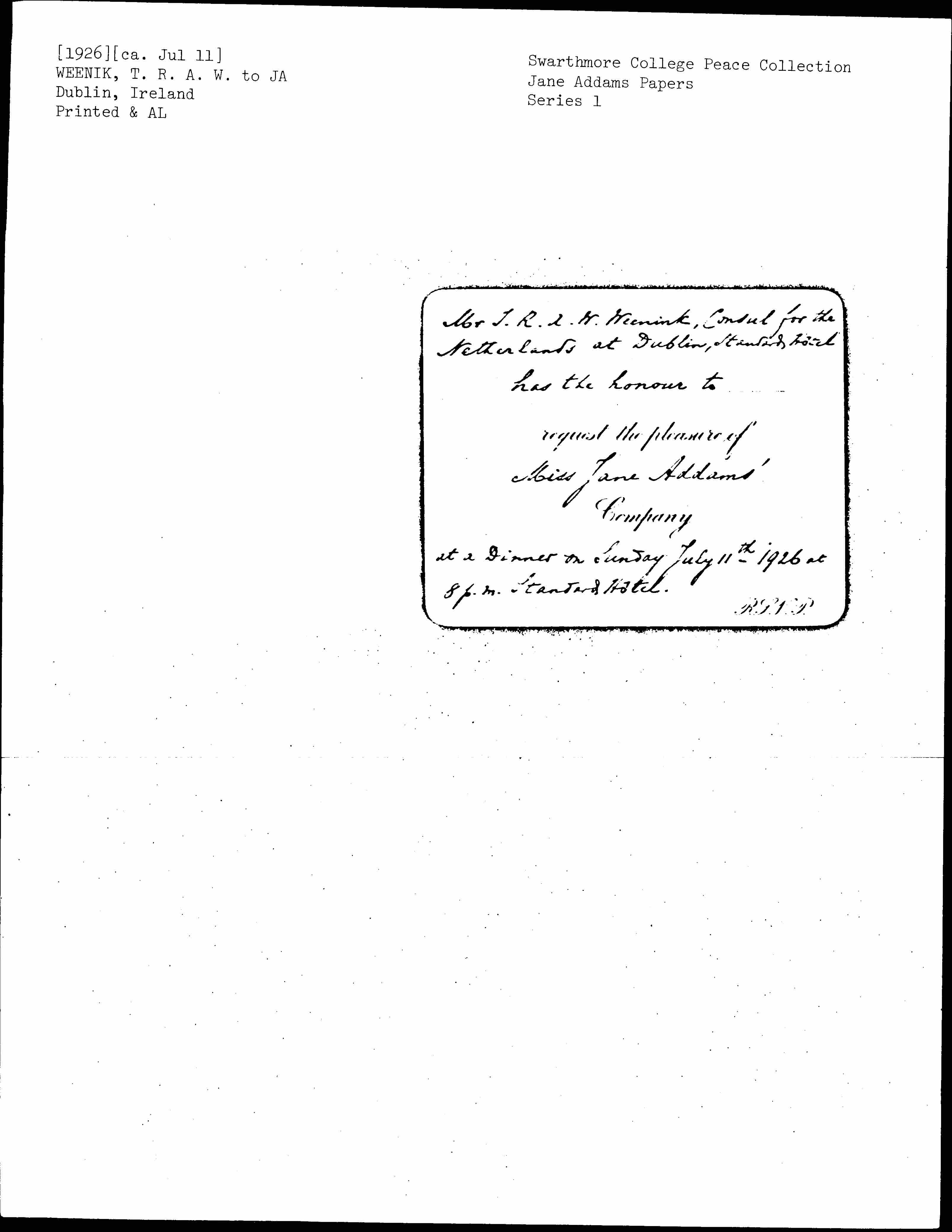 at a Dinner on Sunday July 11th 1926 at 8 p.m. Standard Hotel.