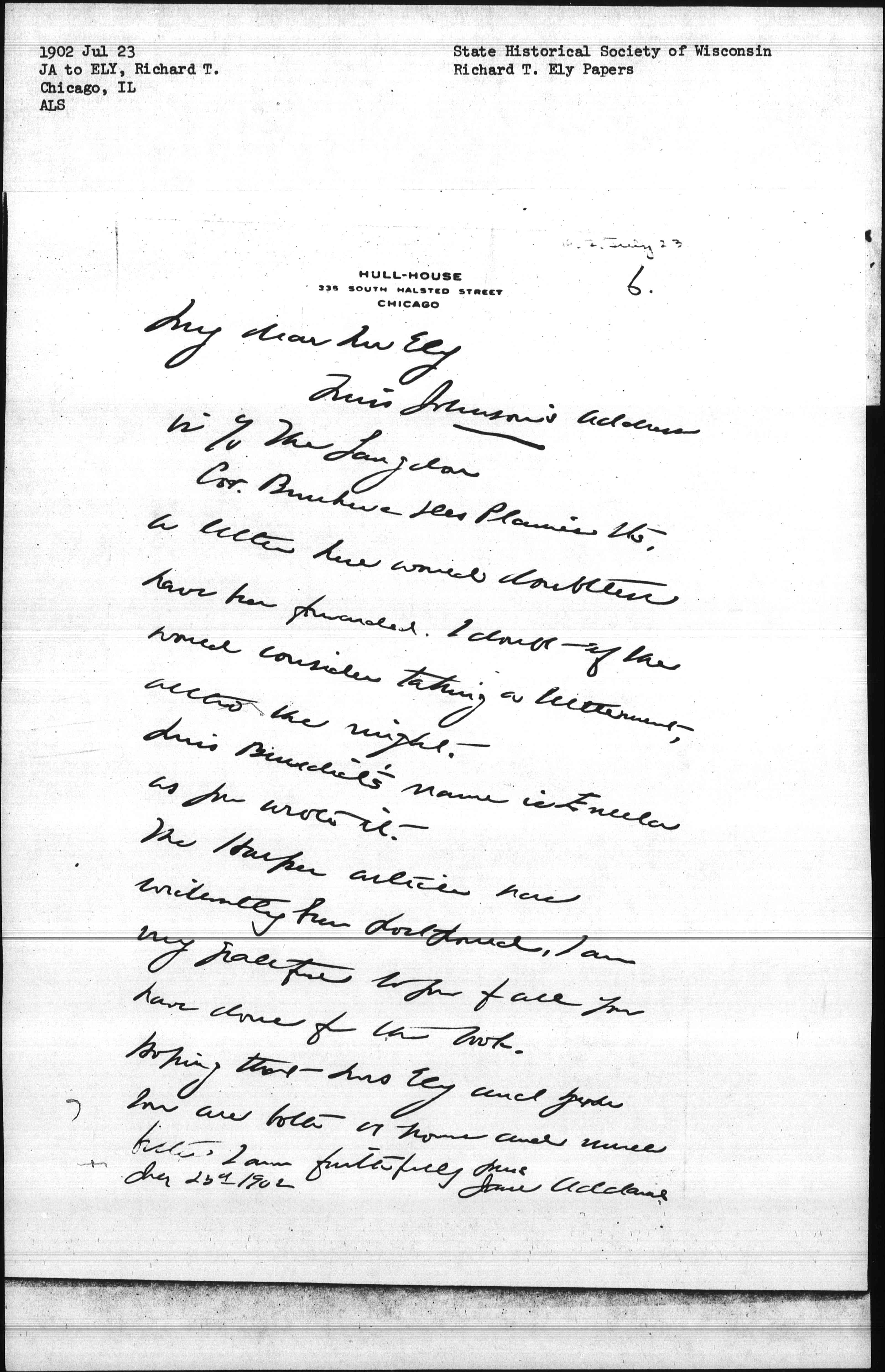 Hoping that Mrs Ely and you [now] are both at home and much better. I am faithfully yoursJane Addams