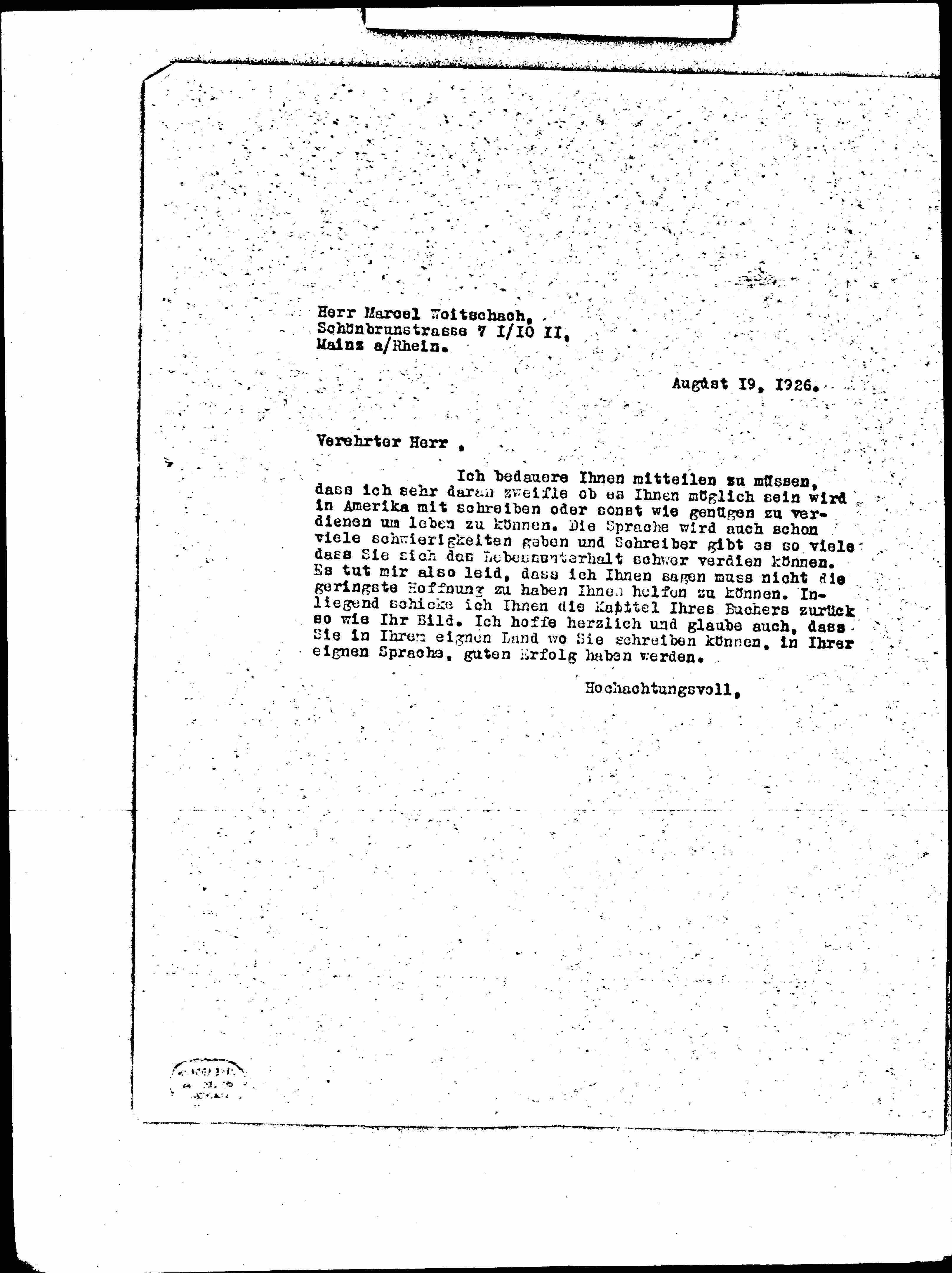 I regret to inform you that I very much doubt whether you will be able to write or otherwise earn enough to live on in America. The language will also give many difficulties and there are so many writers that it is difficult for them to earn a living. So I'm sorry to tell you that I don't have the slightest hope of being able to help you. Enclosed I am sending you back the chapters of your book as well as your picture. I sincerely hope and believe that you will have good success in your own country where you can write in your own language.