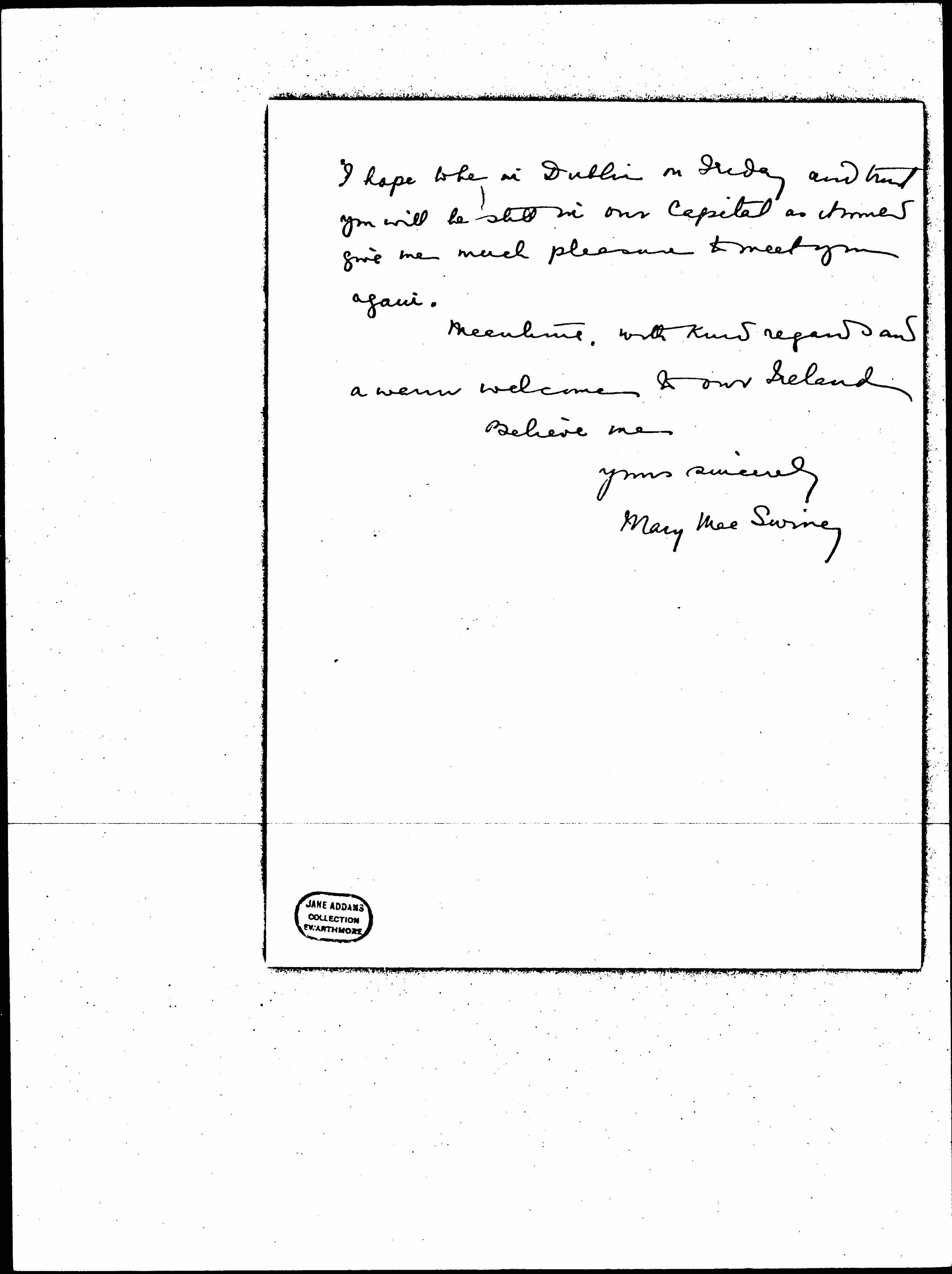 I hope to be in Dublin on Friday and trust you will be still in our Capital as it would give me much pleasure to meet you again.