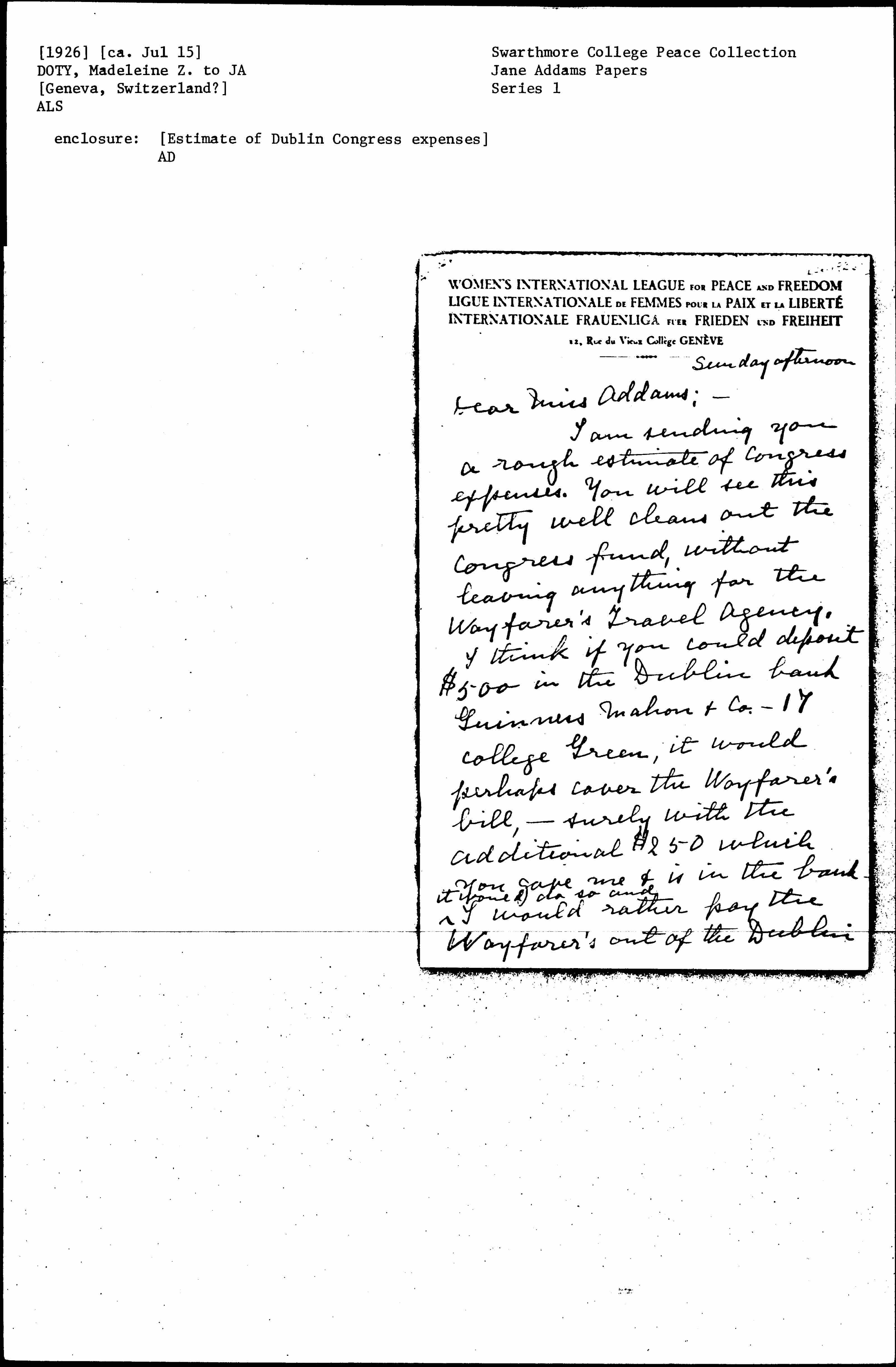 I am sending you a rough estimate of Congress expenses. You will see this pretty well cleans out the Congress fund, without leaving anything for the Wayfarer's Travel Agency. I think if you could deposit $500 in the Dublin bank Guinness Mahon & Co. -- 17 College Green, it would perhaps cover the Wayfarer's bill, -- surely with the additional $250 which you gave me & is in the bank ↑it would do so and↓ I would rather pay the Wayfarer's out of the Dublin [page 2] bank & not complicate our Geneva expenses if possible.