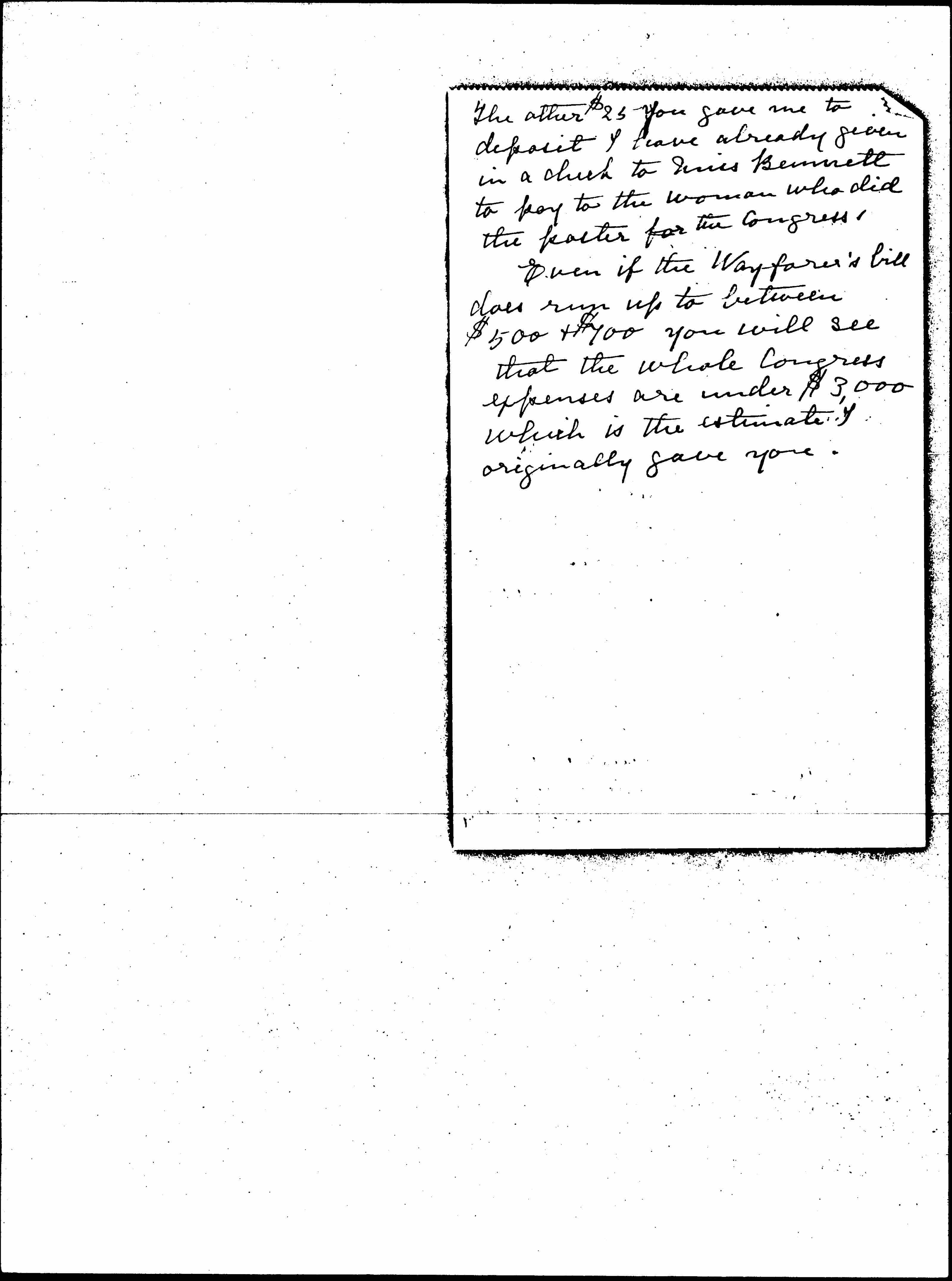 The other $25 you gave me to deposit I have already given in a check to Miss Bennett to pay to the woman who did the poster for the Congress.