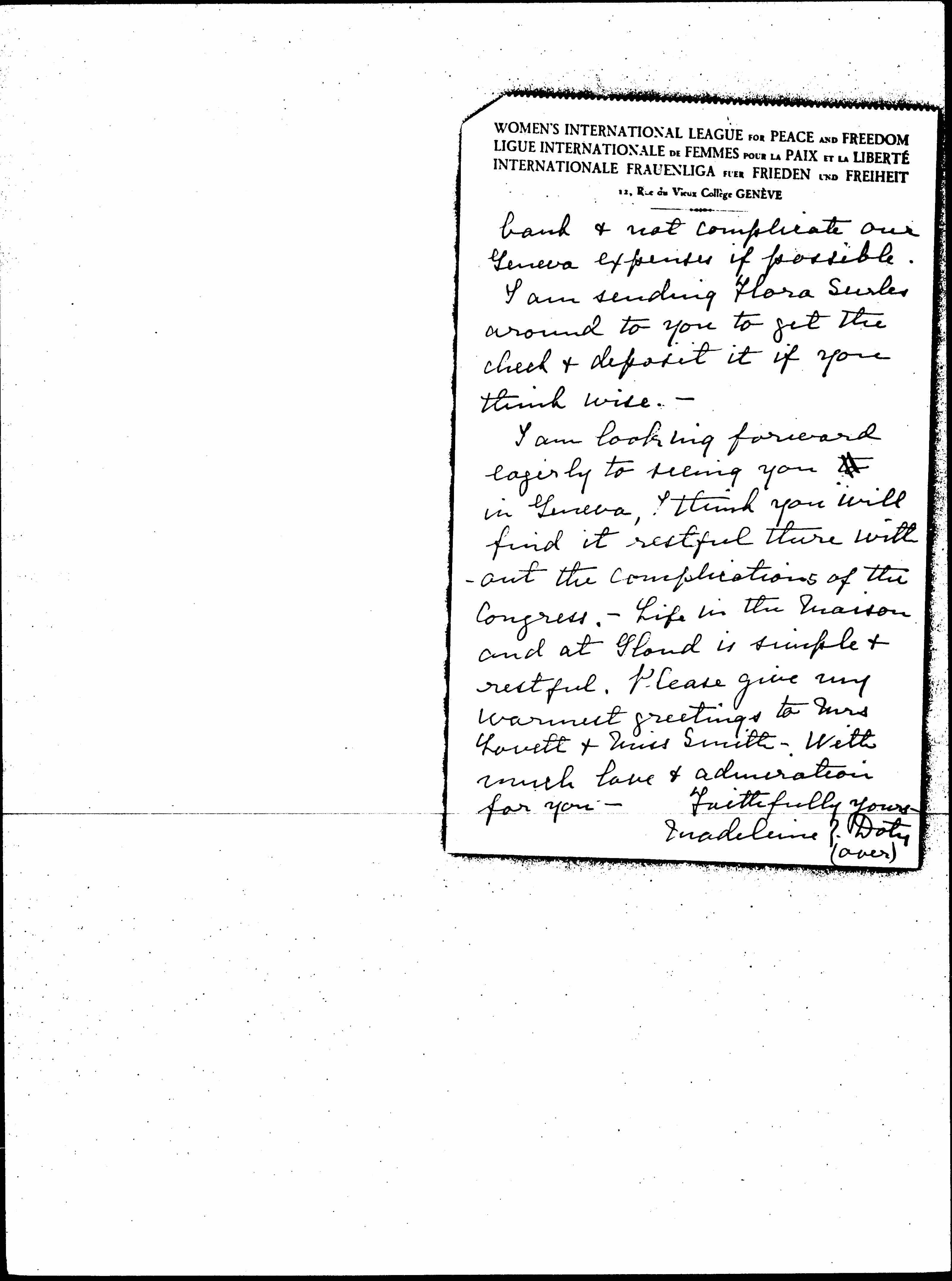 I am looking forward eagerly to seeing you to in Geneva, I think you will find it restful there without the complications of the Congress. -- Life in the Maison and at Gland is simple & restful. Please give my warmest greetings to Mrs Lovett & Miss Smith. With much love & admiration for you --