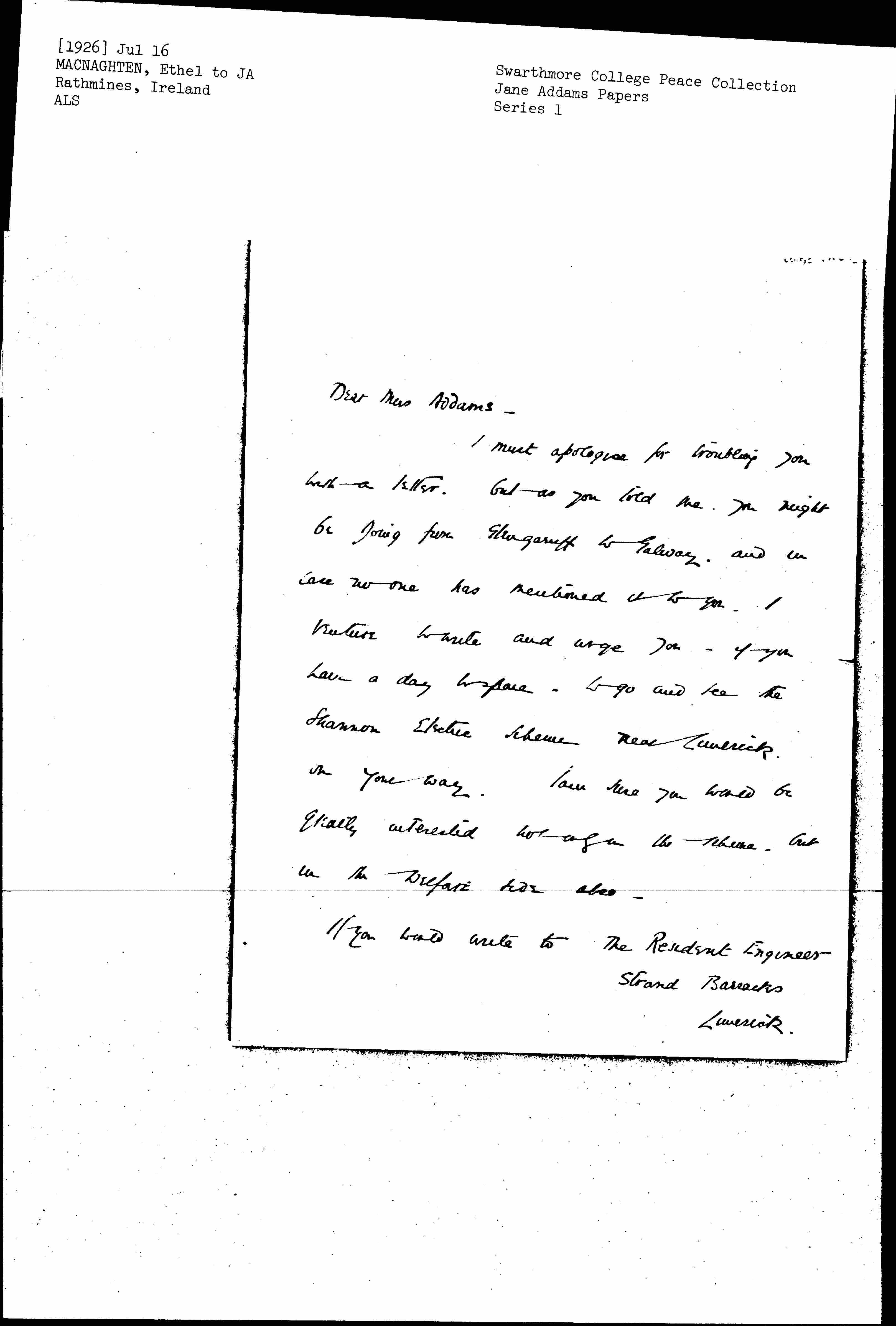 I must [apologize] for troubling you with a letter, but as you told me, you might be going from [Glengarriff] to Galway, and in case no one has mentioned it to you, I venture to write and urge you -- if you have a day to spare -- to go and see the Shannon Electric Scheme near Limerick on your way. I am sure you would be greatly interested not only in the scheme, but in the welfare side also.