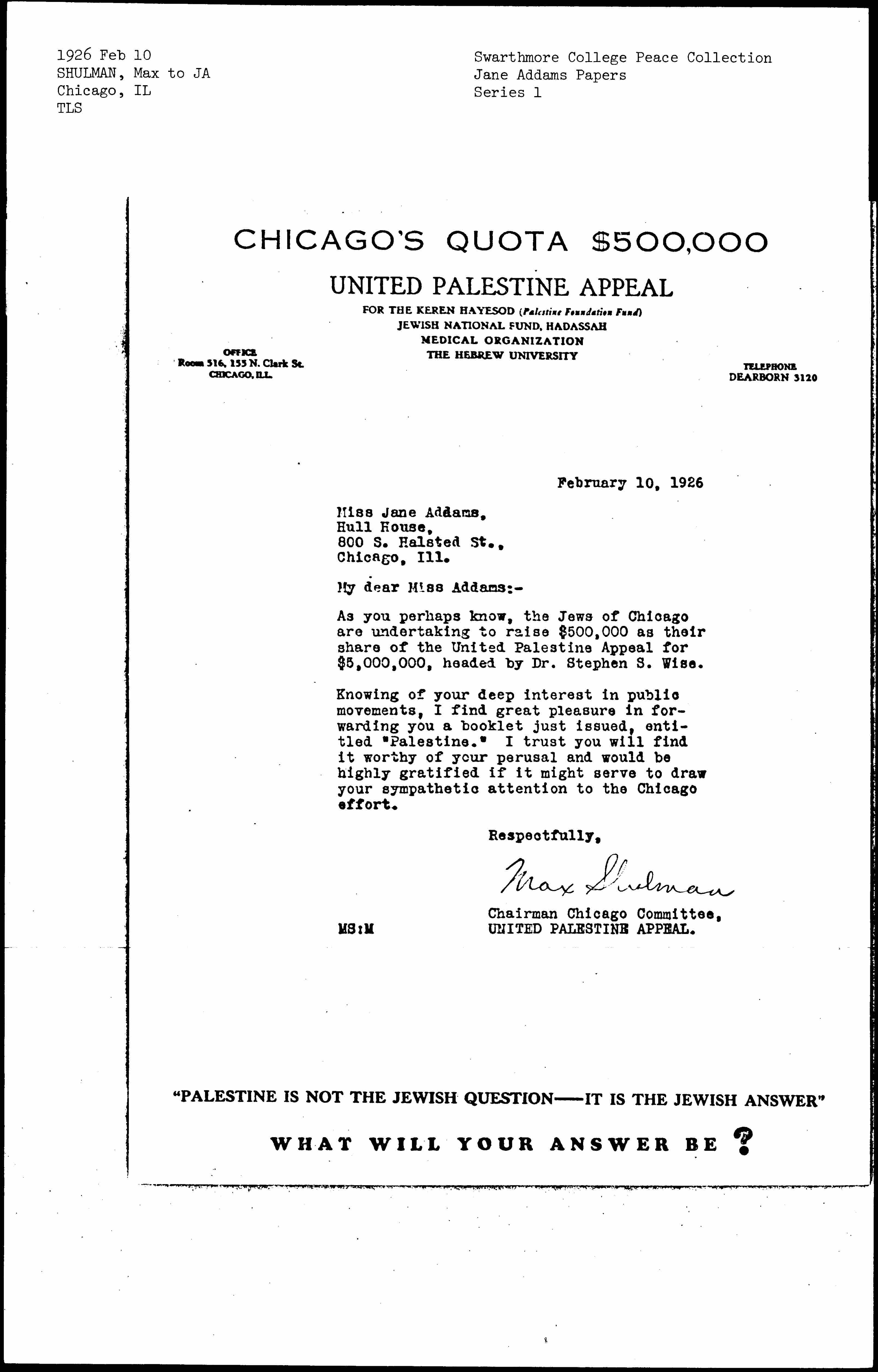 As you perhaps know, the Jews of Chicago are undertaking to raise $500,000 as their share of the United Palestine Appeal for $5,000,000, headed by Dr. Stephen S. Wise.